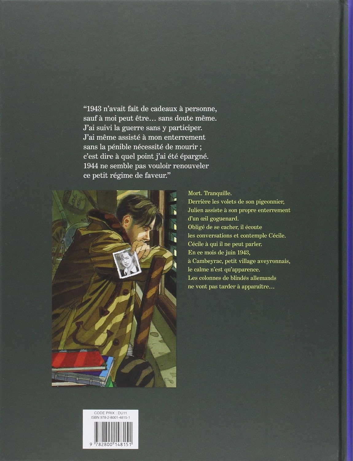 «1943 год не был для меня человеком, который был моим, возможно, еще... без всяких мемов. Я знаю войну без и участников. Я помог мне войти в дом без пенибл, который мне нужен; это самое ужасное, что я стал прозрачным. 1944 год не был похож на обновленный режим маленького режима. » . Морт. Спокойно.. Derrière les volets de son pigeonnier, Жюльен помогает сыну, который вошел в дом oeil gogenard.. Obligé de se cacher, il écoute les разговоры и созерцание Сесиль. Сесиль, которая не может говорить. В июле 1943 года в Камбейраке, в маленькой деревне в Аверонне, спокойствие не было таким, как кажется.