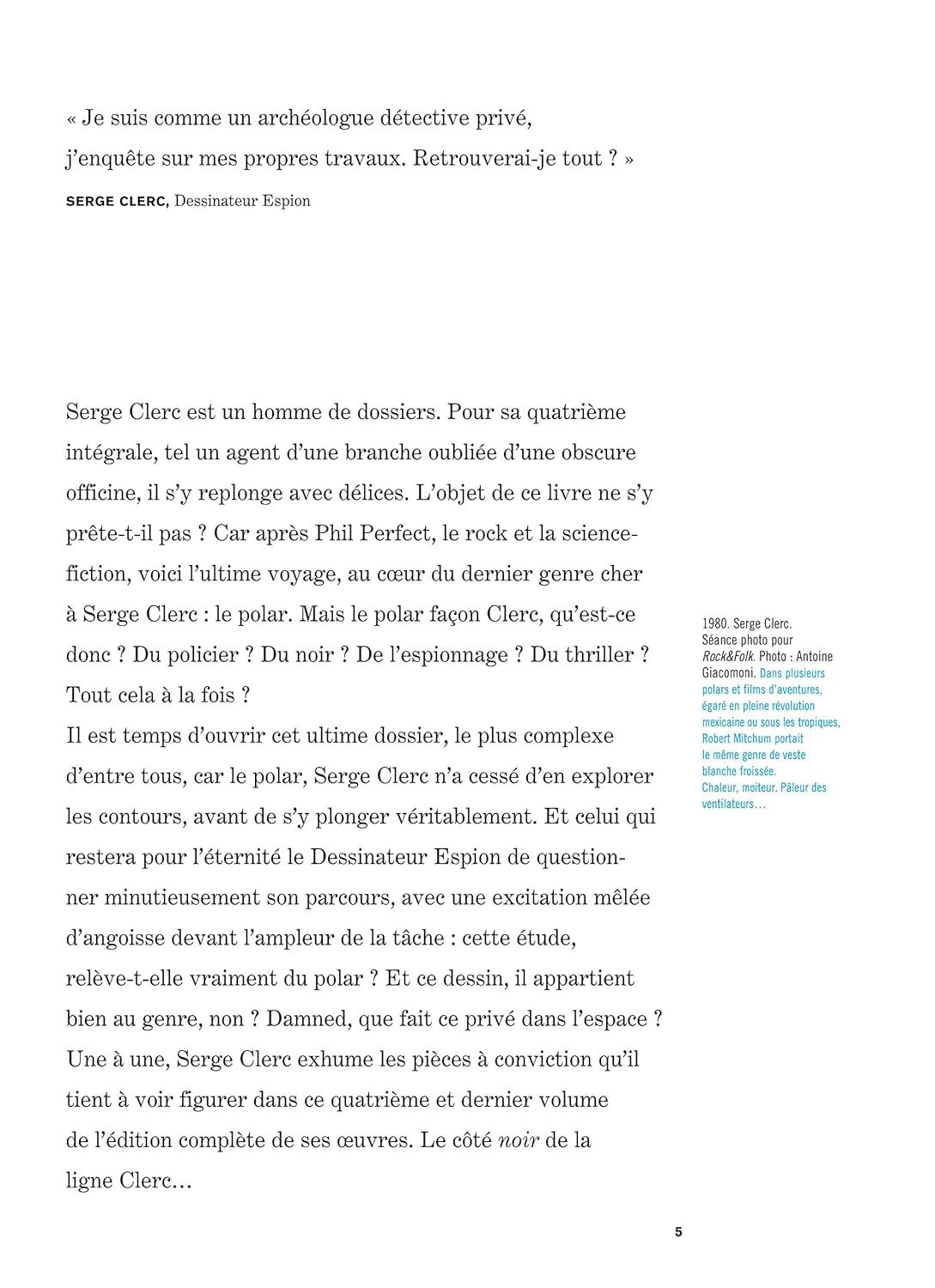 «Je n'ai pas passé mon bac, c'est le bac qui s'est passé de moi», dit-il и et c'est vrai. Машина 17 лет назад, вместо прохожего сына Сержа Клерк Монте в Париже. Повторяю редактора и шеф-повара Жана-Пьера Дионне, прогуливаясь по адресу рисунков по почте, художника-самоучки, бросившегося в цельный металл, от копья взрыва BD для взрослых с Мебиусом, Дрюйе или на бис Корбена в сыне Борда. Сын премьер-альбома, Le Dessinateur espion!, том 1 мифического Фила Перфекта, выпущенный в 1978 году компанией Humanoïdes associés, под названиями австралийских мажоров, таких как Сэм Бронкс и роботы (1981) или La Nuit du Mocambo (1983). Среди двух Филов Перфекта Серж Клерк реализовал Капитана Футура (сценарий Филиппа Маневра? Ассоциация гуманоидов, 1979) и Мелани Уайт (сценарий Жана-Патрика Маншетта, Ашетт, 1979). Он участвует в этой эпохе в кругах коллективов, или он является частью дружбы сильных мира с авторами, которые говорят Иву Шаланду, Лусталю, Теду Бенуа или Фрэнку Маржерину на бис. Графический курант начинает свой путь к дневному свету, предлагая современное размышление и ироническую мысль о светлой дороге.