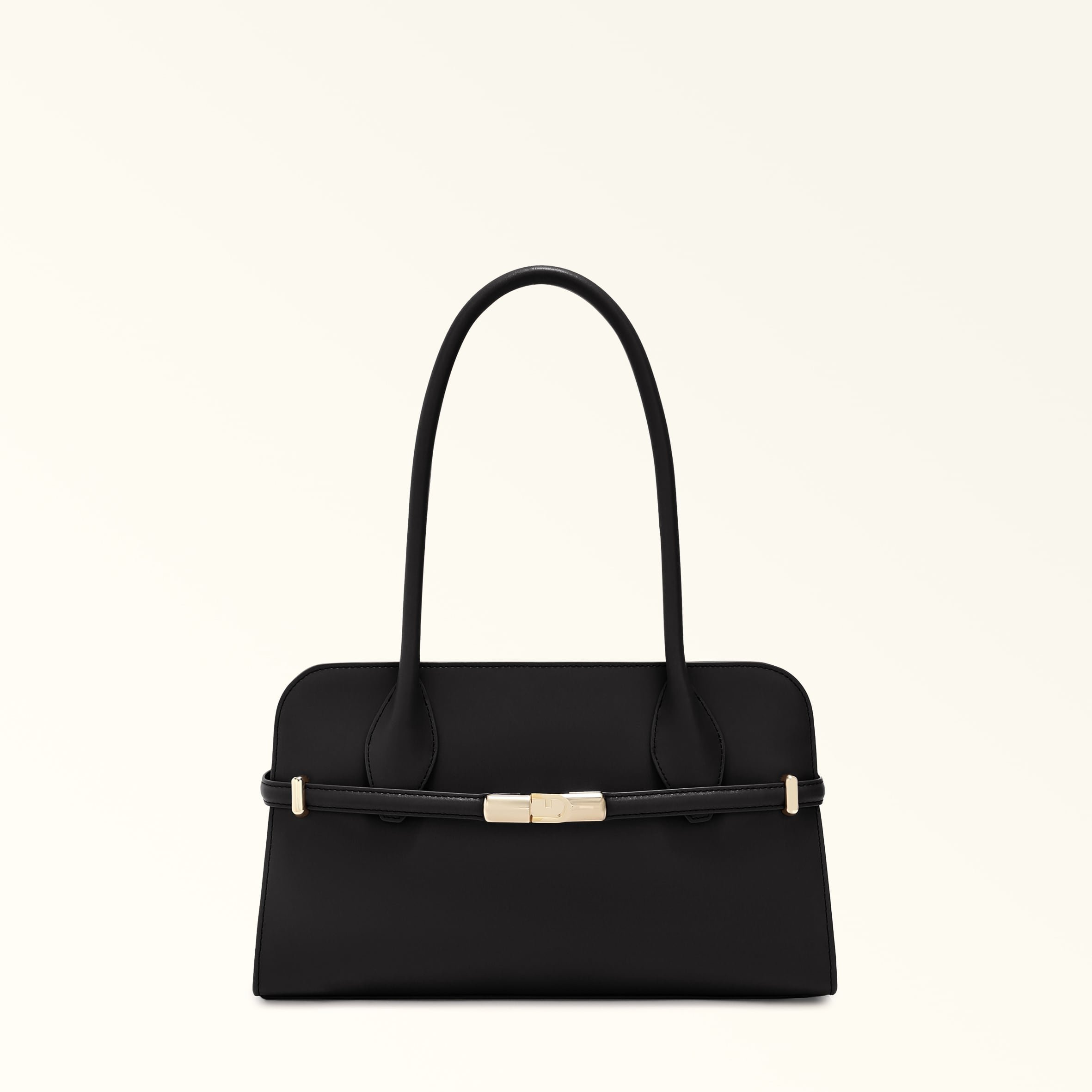 Эта вместительная сумка Furla Goccia размера M изготовлена из гладкой телячьей кожи и украшена полированной цилиндрической фурнитурой с логотипом в виде арки.