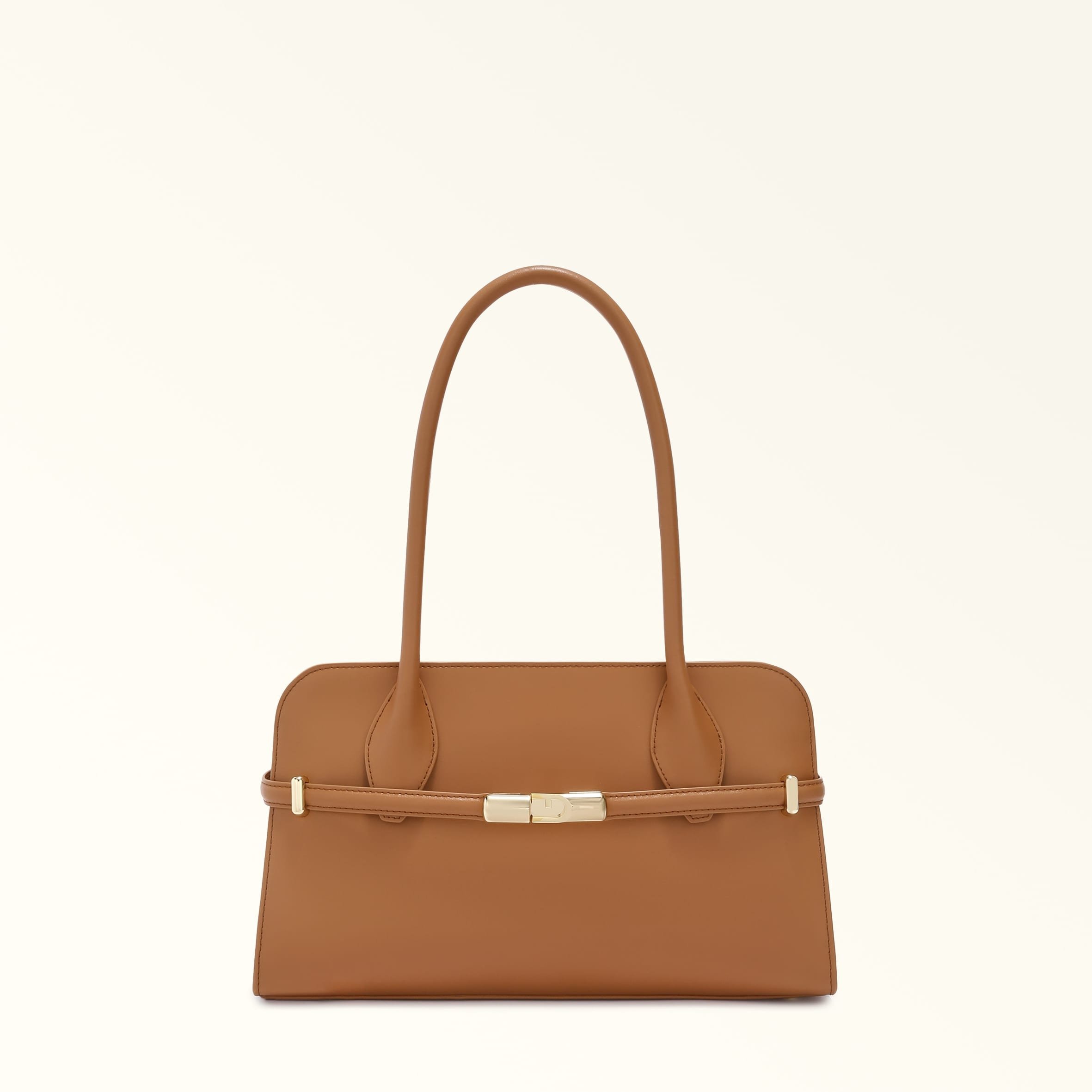 Эта вместительная сумка Furla Goccia размера M изготовлена из гладкой телячьей кожи и украшена полированной цилиндрической фурнитурой с логотипом в виде арки.