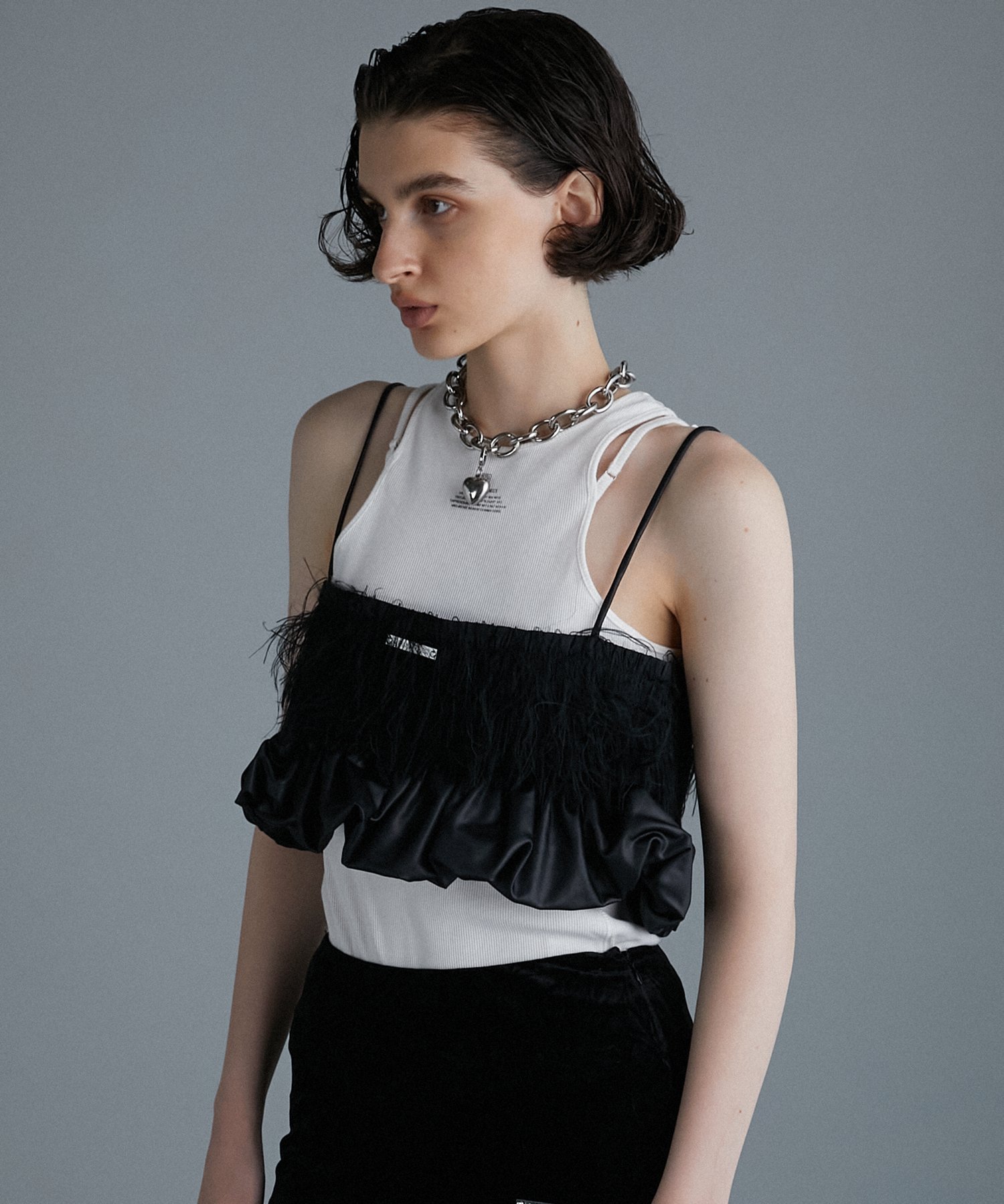 Этот бюстье отличается интересным сочетанием мягкой, длинноворсовой ткани, напоминающей перья, и атласа, похожего на кожу.