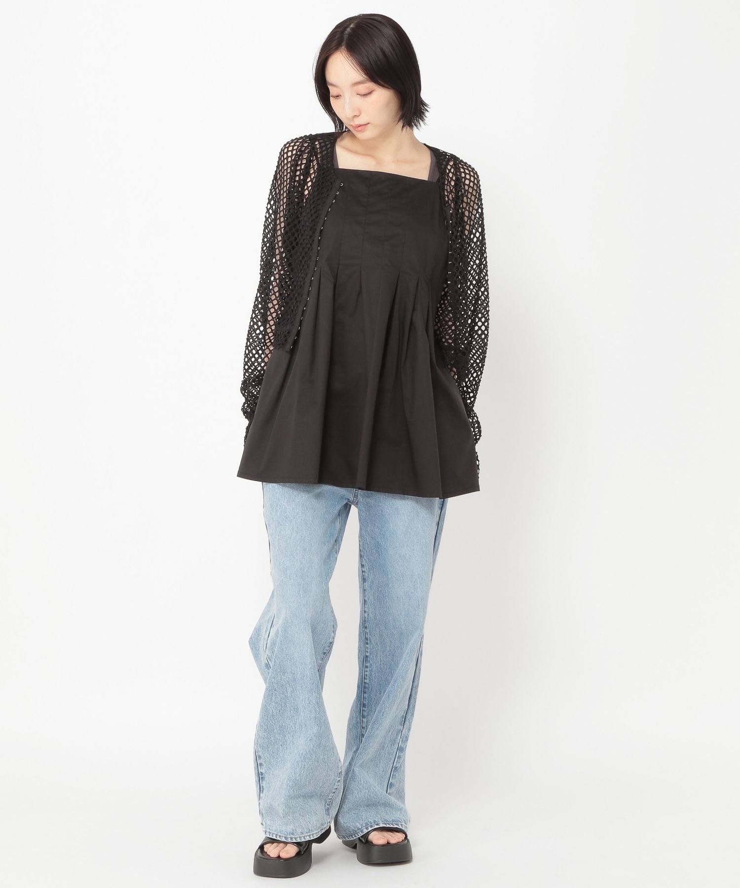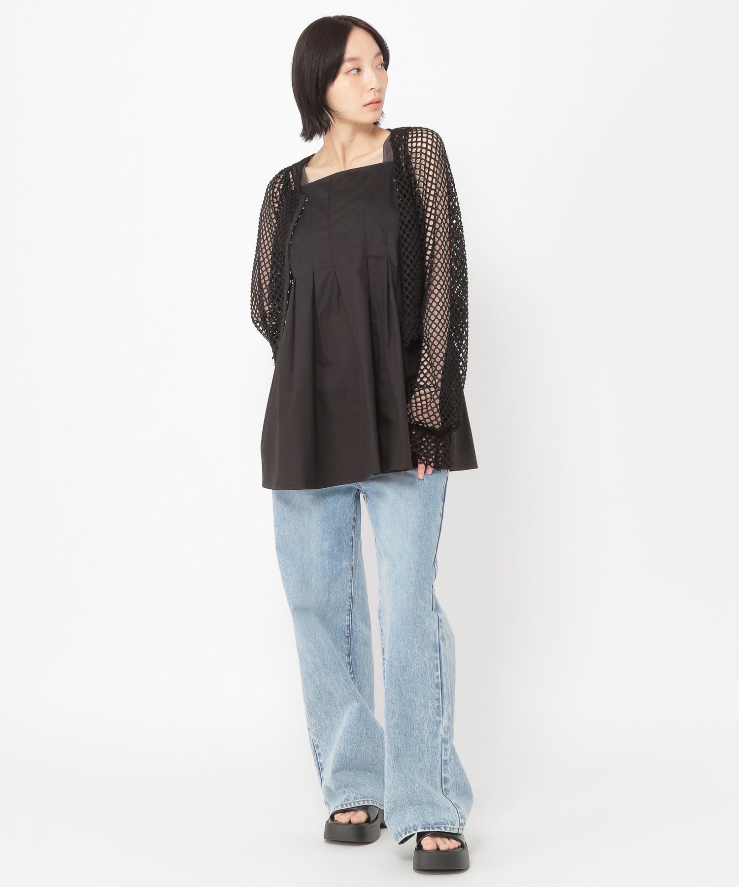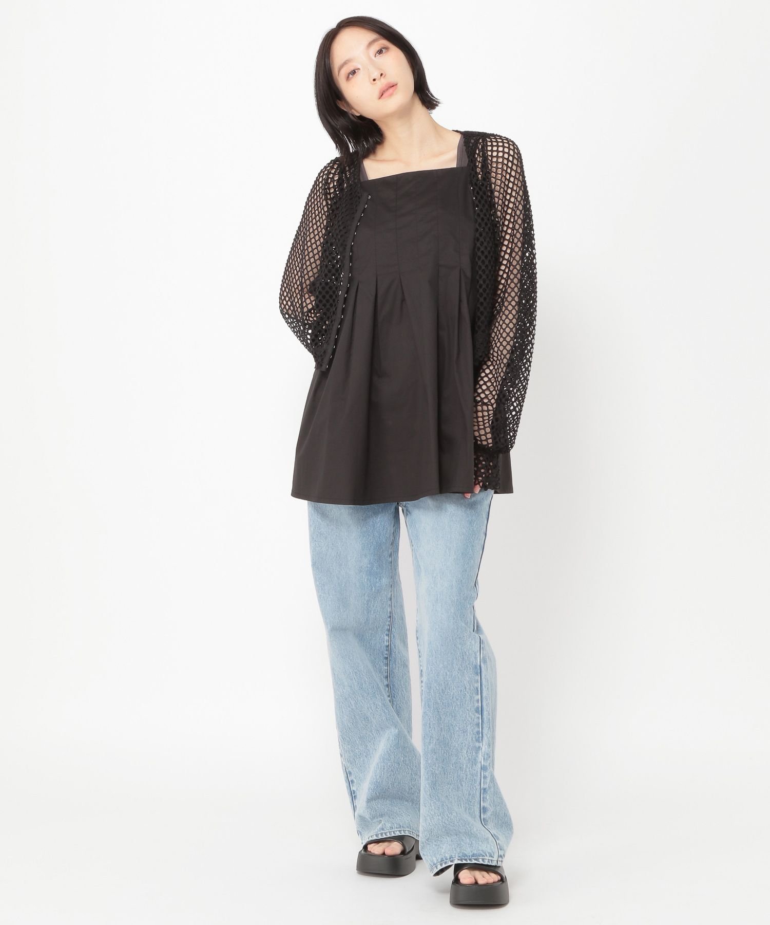 Мы также рекомендуем сочетать его с удобными расклешенными брюками в комплекте◎