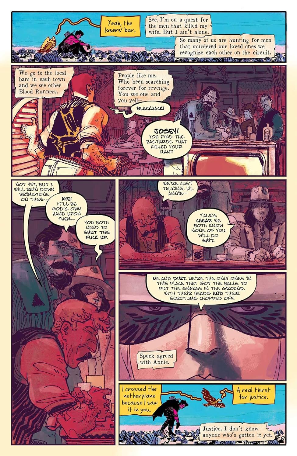 Графический роман ABOVE SNAKES, сочетающий в себе элементы вестерна в стиле грайндхаус и экзистенциальной одиссеи, объединяет острый юмор, яркую стилизацию и эмоциональную глубину, создавая незабываемое произведение, над которым невероятно поработала команда, создавшая THUMBS и THE FEW.