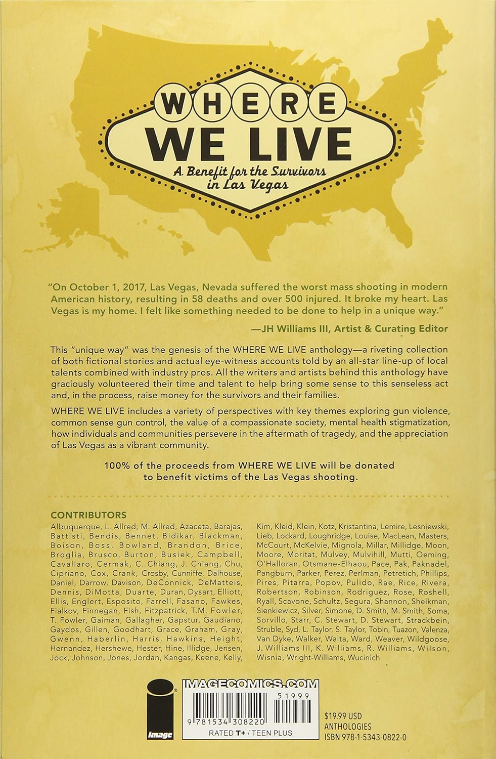 Этот «уникальный способ» стал отправной точкой для создания антологии «Где мы живем» - захватывающей коллекции как вымышленных историй, так и реальных свидетельств очевидцев, рассказанных звездным составом лучших авторов комиксов современности. Все создатели любезно пожертвовали своим временем и талантом, чтобы помочь внести ясность в этот бессмысленный акт и, в процессе, собрать средства для выживших и их семей.