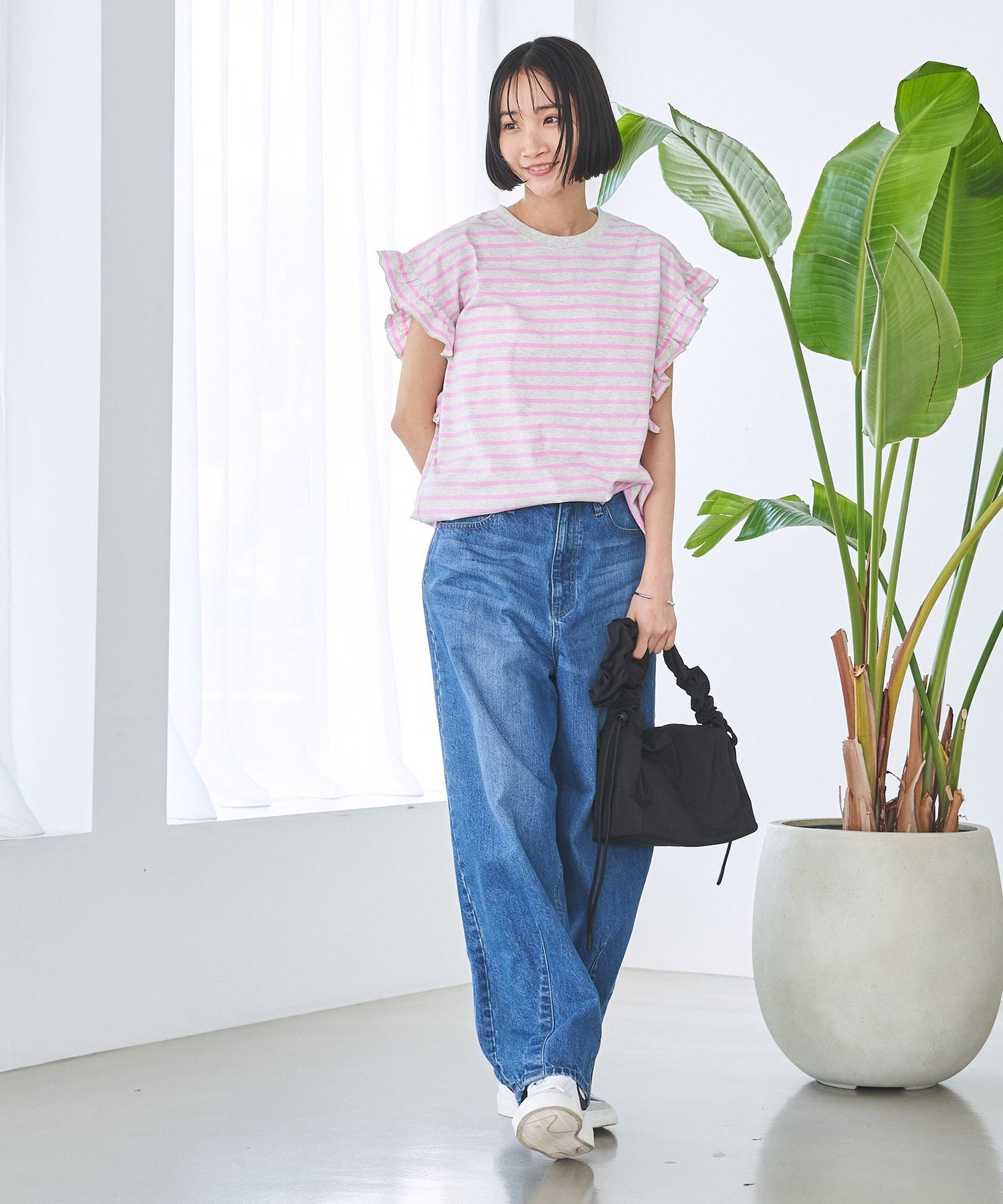 Популярная полосатая футболка с рукавами-воланами, добавляющими нотку гламура.