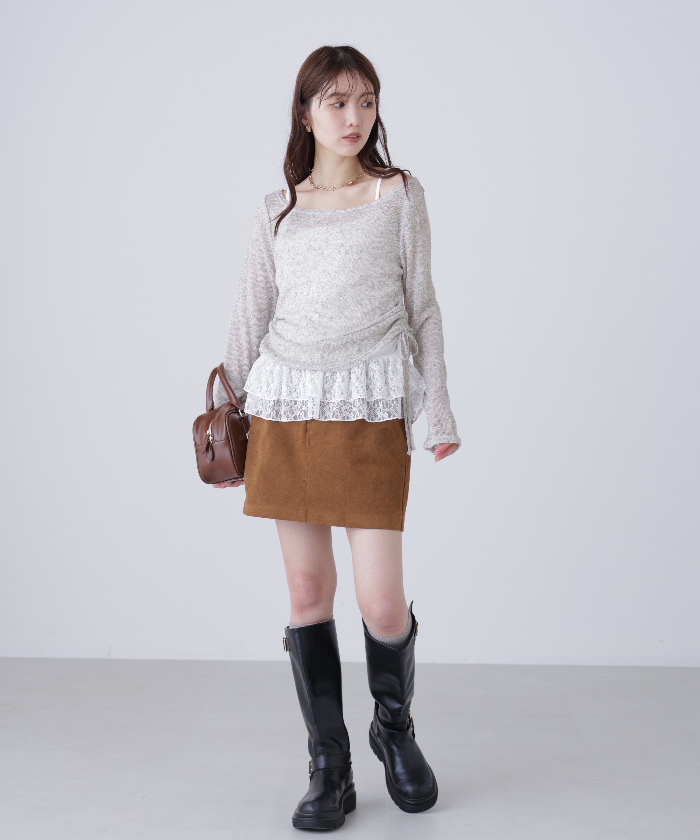 Этот комплект включает в себя освежающий меланжевый прозрачный топ и майку с кружевной оборкой по низу. Топ имеет вырез-лодочку, который можно носить как топ на одно плечо, создавая расслабленный образ, а длина регулируется шнурками с обеих сторон. Внутренний слой выполнен из умеренно плотной ребристой ткани с нежной кружевной оборкой по низу, что добавляет простоты, женственности и непринужденности. Умеренно приталенный силуэт и длинные рукава позволяют легко создавать многослойные образы, а также отлично смотрятся сами по себе. Сочетайте его с широкими джинсами или брюками-карго для создания сладкого и пикантного стиля Y2K, или с мини-юбкой и высокими сапогами для более женственного образа! Этот предмет одежды идеально сочетает в себе нежность и прохладу, становясь центральным элементом любого наряда.