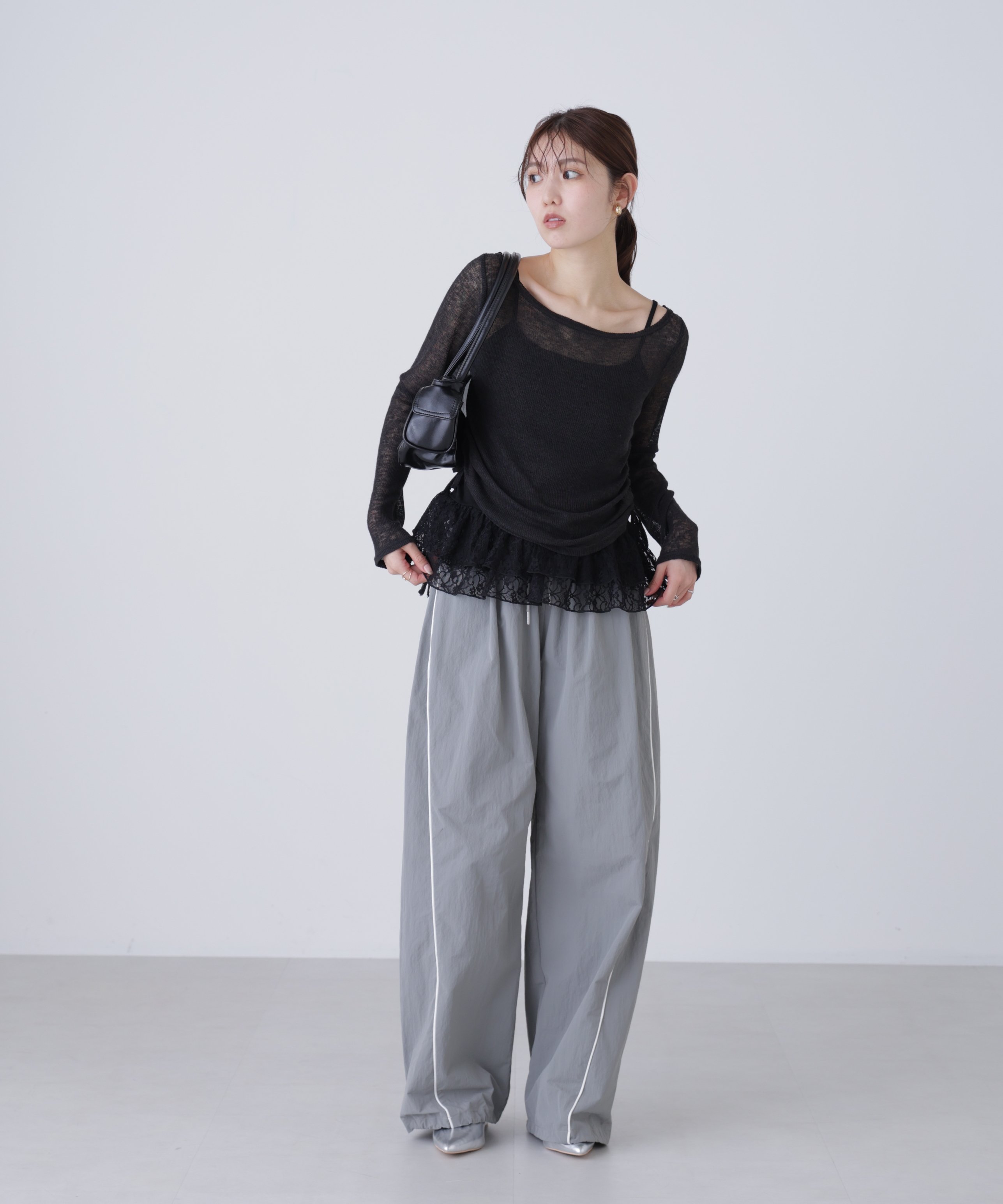 Этот комплект включает в себя освежающий меланжевый прозрачный топ и майку с кружевной оборкой по низу. Топ имеет вырез-лодочку, который можно носить как топ на одно плечо, создавая расслабленный образ, а длина регулируется шнурками с обеих сторон. Внутренний слой выполнен из умеренно плотной ребристой ткани с нежной кружевной оборкой по низу, что добавляет простоты, женственности и непринужденности. Умеренно приталенный силуэт и длинные рукава позволяют легко создавать многослойные образы, а также отлично смотрятся сами по себе. Сочетайте его с широкими джинсами или брюками-карго для создания сладкого и пикантного стиля Y2K, или с мини-юбкой и высокими сапогами для более женственного образа! Этот предмет одежды идеально сочетает в себе нежность и прохладу, становясь центральным элементом любого наряда.
