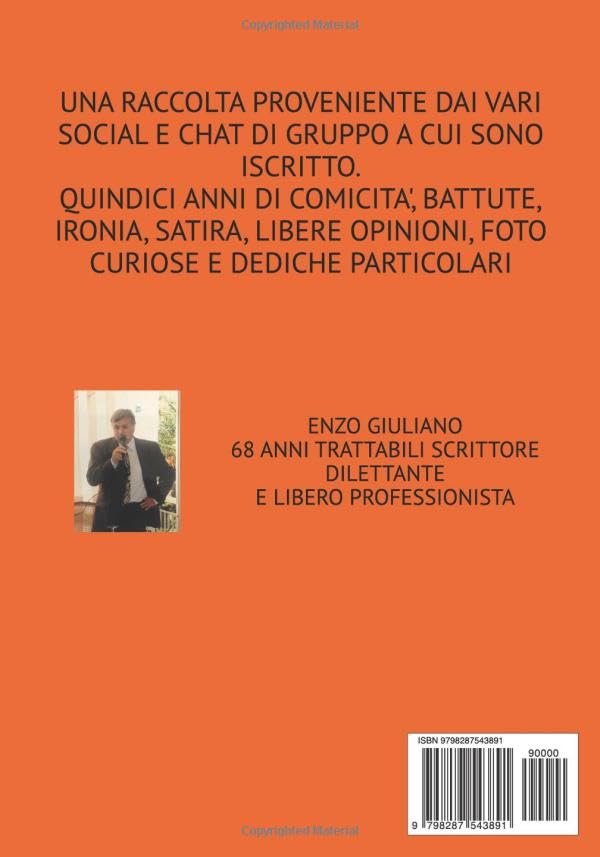 DAI VARI SOCIAL E CHAT DI GRUPPO UNA RACCOLTA DI QUINDICI ANNI DI COMICITA', BATTUTE, SATIRA, IRONIA, FOTO CURIOSE COMMENTATE CON IRONIA E DEDICHE PARTICOLARI AD AMICI E PARENTI.