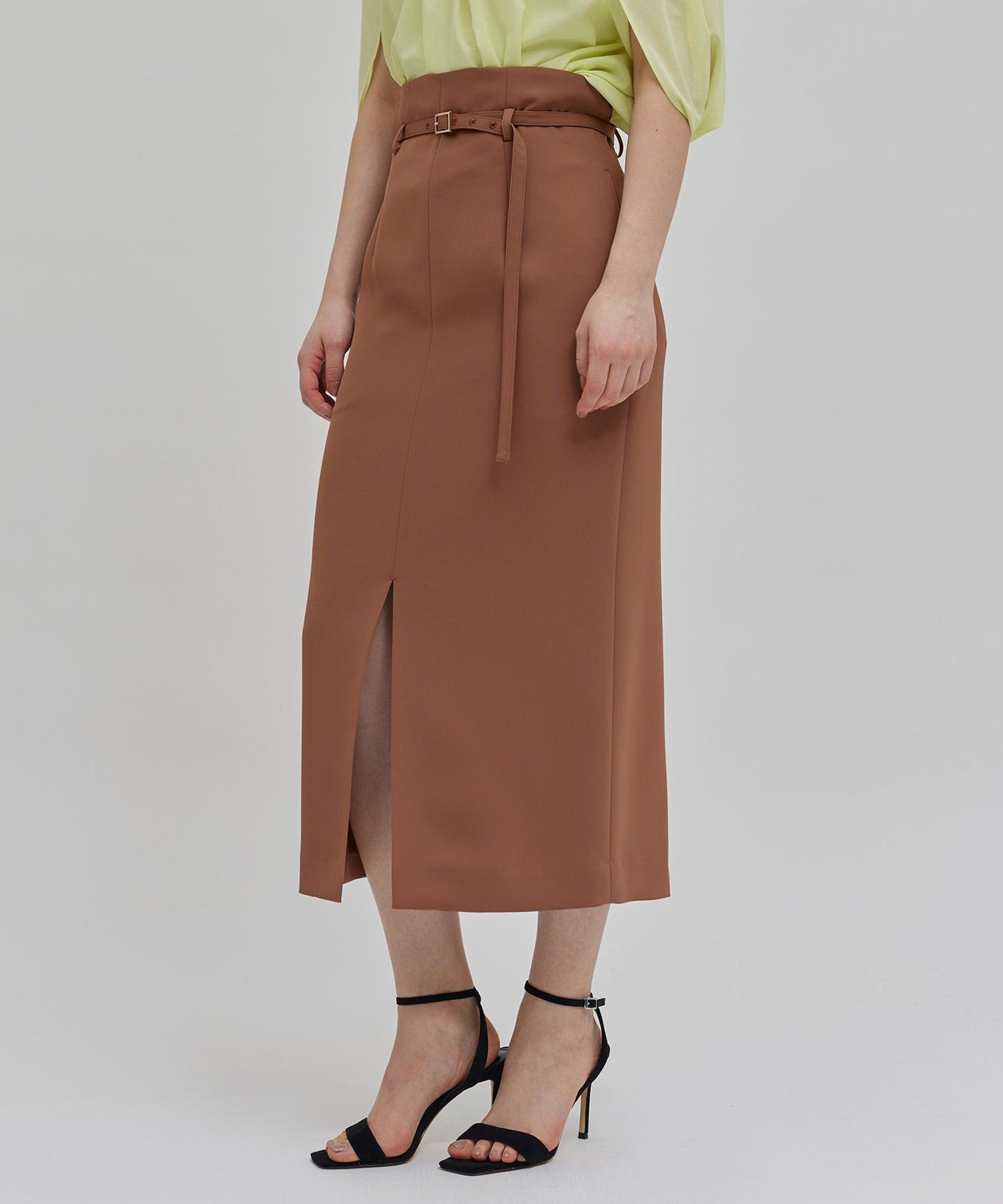 Эта юбка с высокой талией и I-образным силуэтом дополнена поясом в тон. Обтекаемый силуэт позволяет носить ее как заправленной, так и навыпуск. Разрез спереди обеспечивает свободу движений ног и создает ощущение расслабленности. Доступна в различных цветах, таких как белый, черный и бежевый, ее можно сочетать со стильной блузкой или футболкой для создания универсального образа, от работы до повседневной носки.