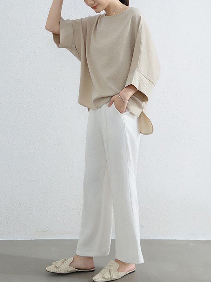 Аккуратный круглый вырез и приспущенные плечи создают элегантное впечатление.