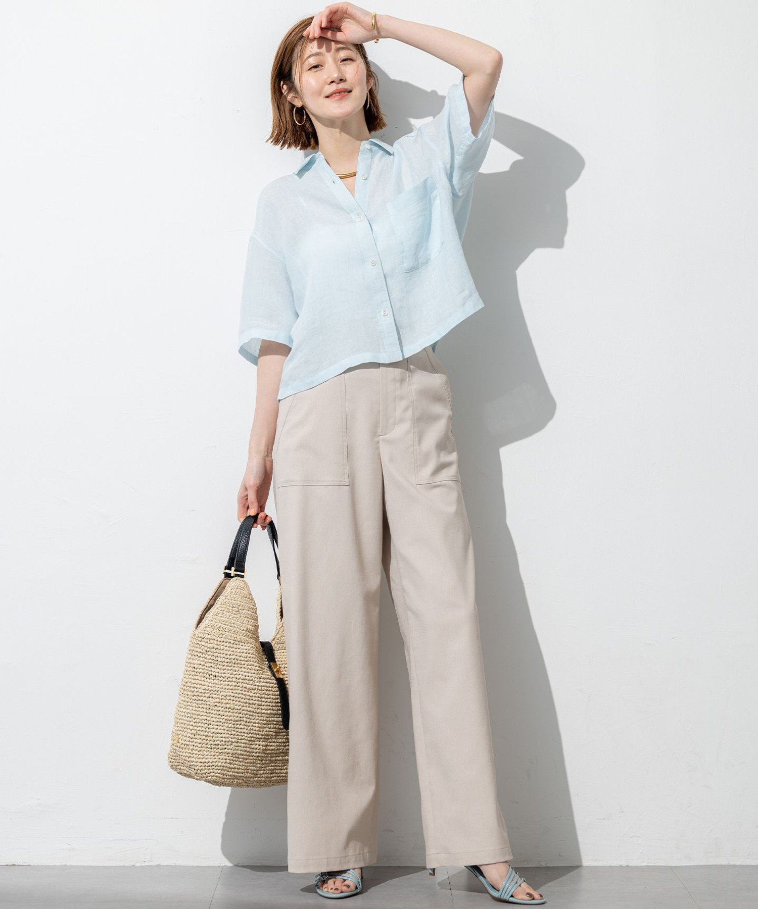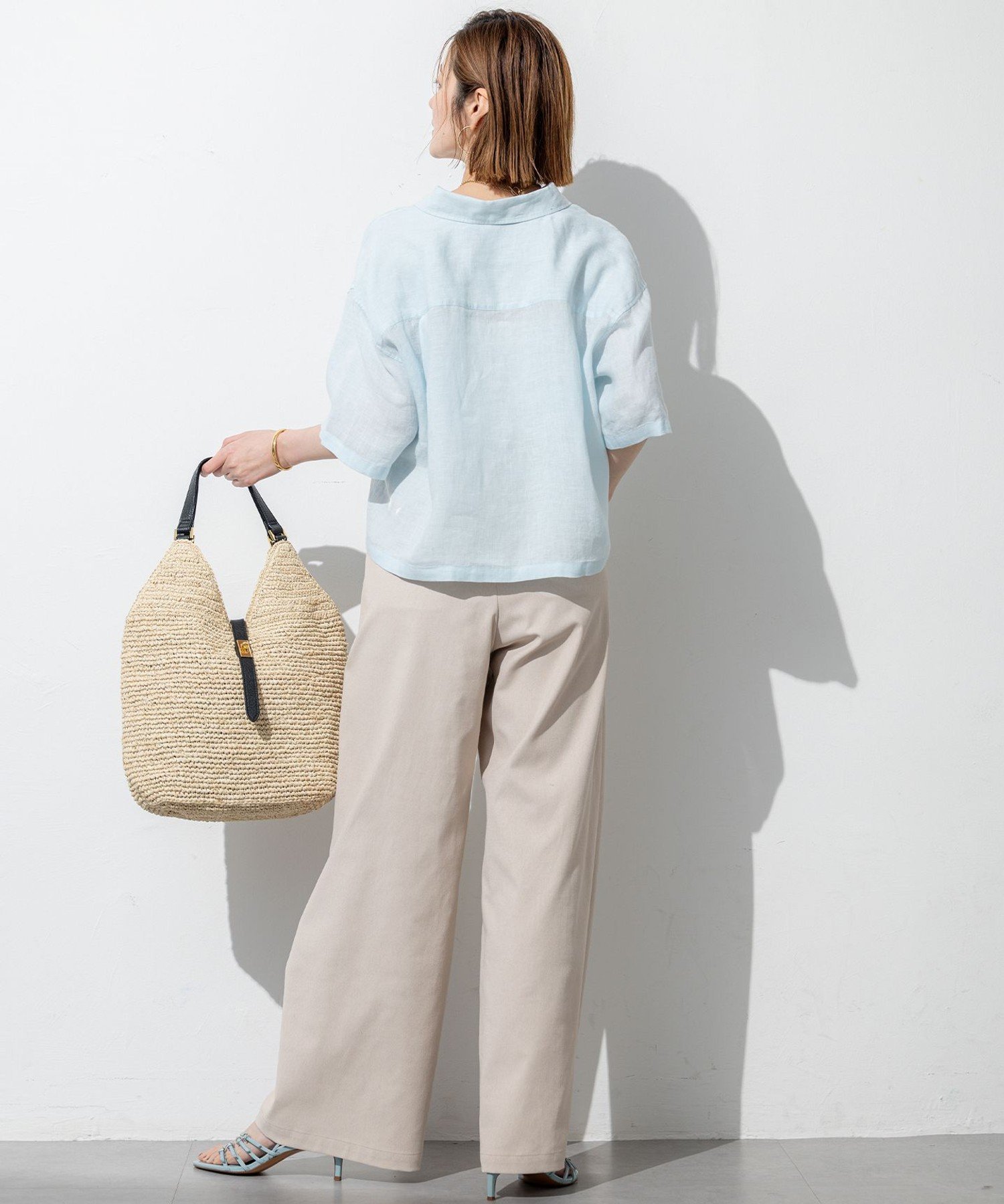 Изготовлены из ткани оксфорд с использованием многофункциональной пряжи Toray "Body Shell Dry". Они отводят влагу, быстро сохнут, устойчивы к УФ-излучению и непрозрачны, что делает их идеальным выбором для брюк и юбк. Кроме того, они изготовлены из хлопка и льна, что придает им текстуру, напоминающую натуральные материалы. Еще одно замечательное свойство – они не мнутся. Это простой в уходе материал, сочетающий в себе непринужденность и элегантный блеск.