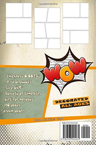 Блокнот для создания собственных комиксов включает в себя: ● Размер 6x9 дюймов (маленький) ● 110 страниц с разнообразными шаблонами действий (от 4 до 6 вариантов) ● Толщина бумаги 0,0025 дюйма (обычная 0,0022 дюйма) ● Декорированная обложка. Идеально подходит для эскизов карандашами, чернилами/гелевой ручкой (некоторые толстые маркеры могут просвечивать на оборотную сторону). Для всех возрастов. Отличный подарок на праздники. ● НАЖМИТЕ «ДОБАВИТЬ В КОРЗИНУ»! ● Рисование в блокноте для создания собственных комиксов может уменьшить зависимость от гаджетов. Напишите свою собственную историю на кремовой бумаге.