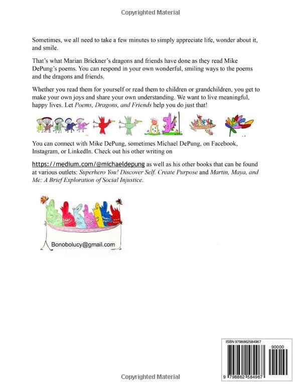 Сборник «Стихи, драконы и друзья» создан благодаря причудливому воображению Майка ДеПунга и Мариан Брикнер. Стихи Майка можно читать на нескольких уровнях, некоторые из них очень глубокие. Драконы Мариан, рассматривая эти стихи, размышляли об их чувствах и решили интерпретировать их по-своему. Прочитайте стихи сами и отреагируйте по-своему, как драконы, или, может быть, просто улыбнитесь.