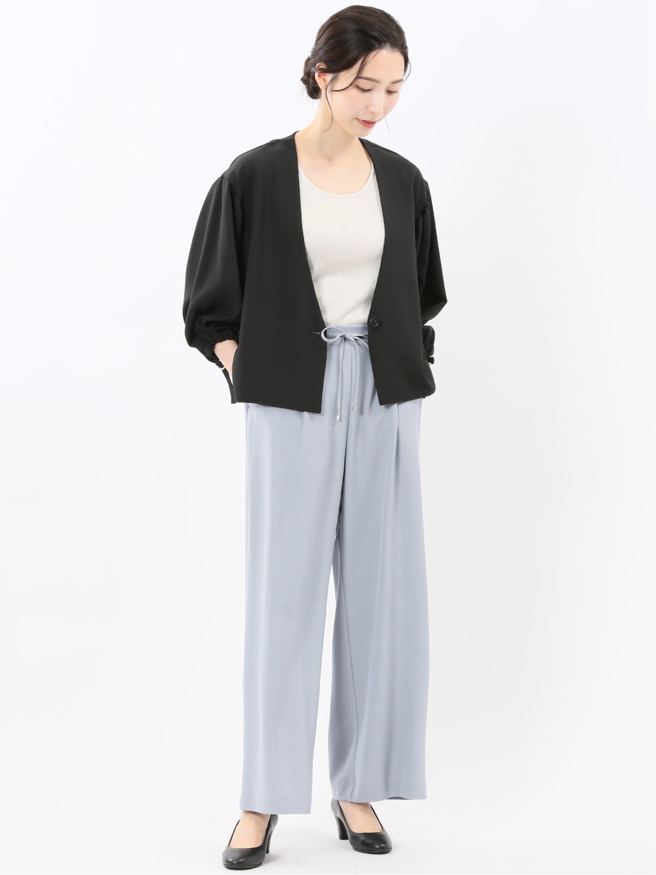 Эти брюки с широкими штанинами имеют одну складку для свободы движений в области талии. Сборка на поясе делает их удобными в ношении. Эти брюки имеют удобную конструкцию без молний и пуговиц, передние и задние карманы, а также обработанный низ. (Длина внутреннего шва M: 68 - L: 69, длина штанины в одну сторону)