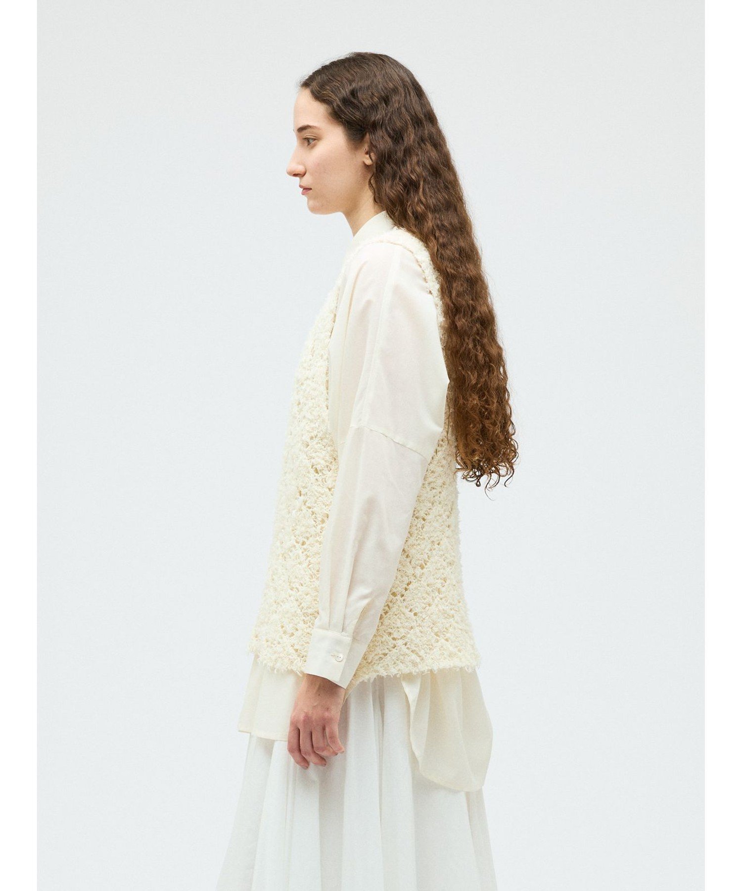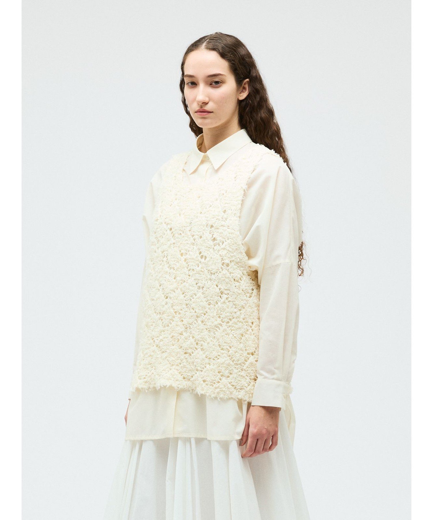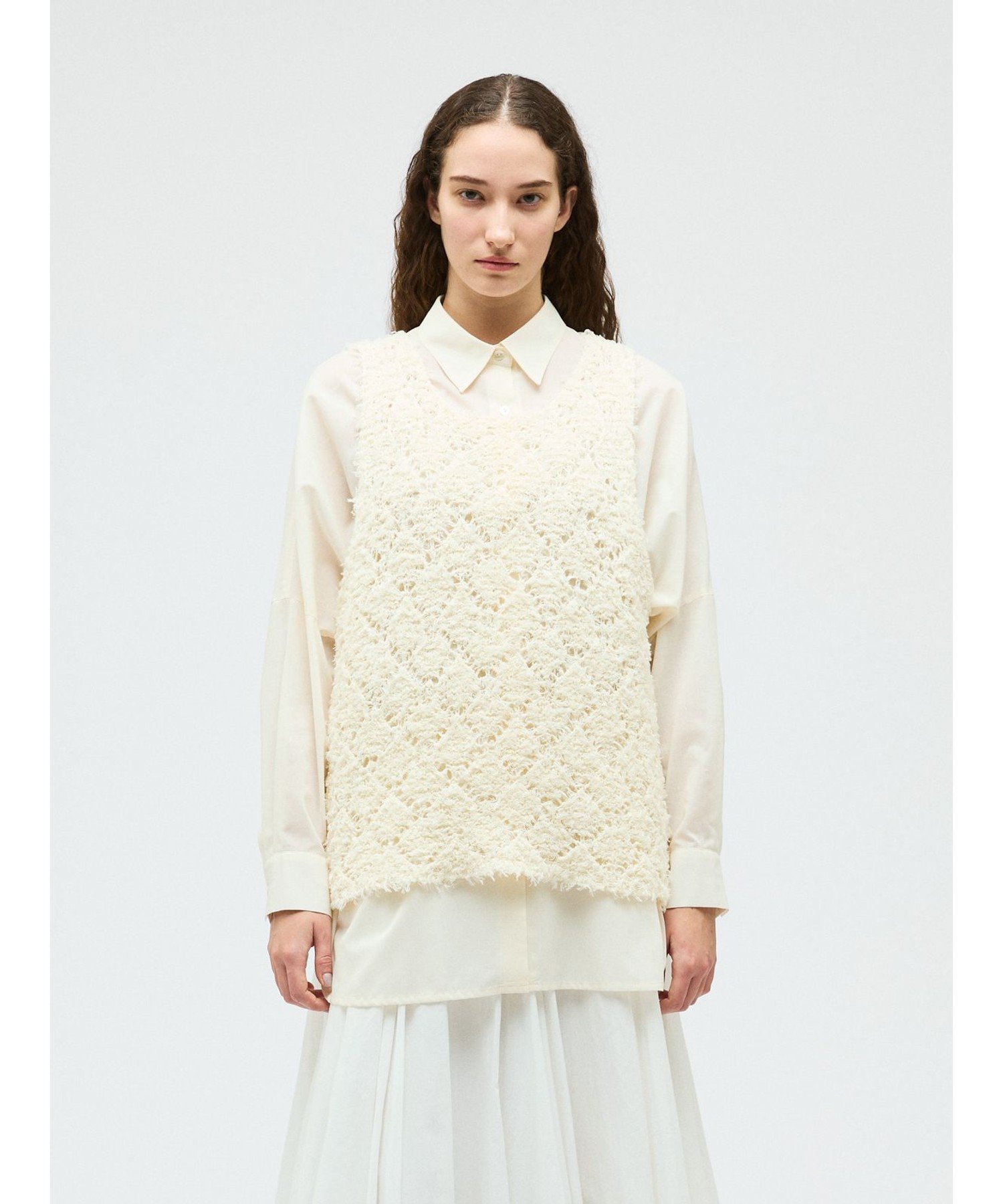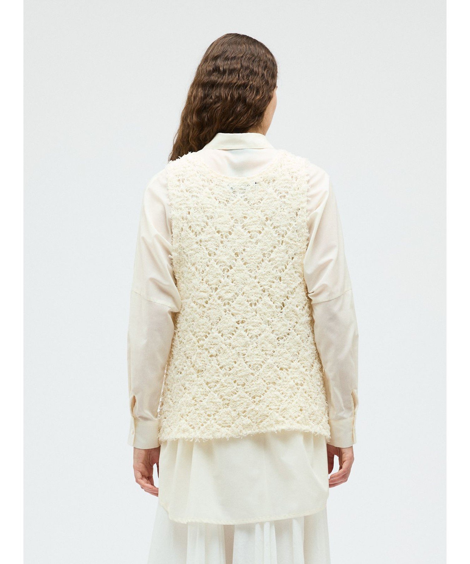 Этот жилет с узором связан из пряжи с бахромой в виде ромбов. Он создает полупрозрачный, трехмерный эффект. Ромбовидный узор ткани подчеркивается цветом внутреннего слоя. Эта оригинальная ткань делает многослойность привлекательной, даже в сочетании с внутренним слоем того же цвета. Длина жилета немного длиннее, чем до бедра. Широкие рукава облегчают надевание. Этот легкий трикотаж также можно стирать в машине.