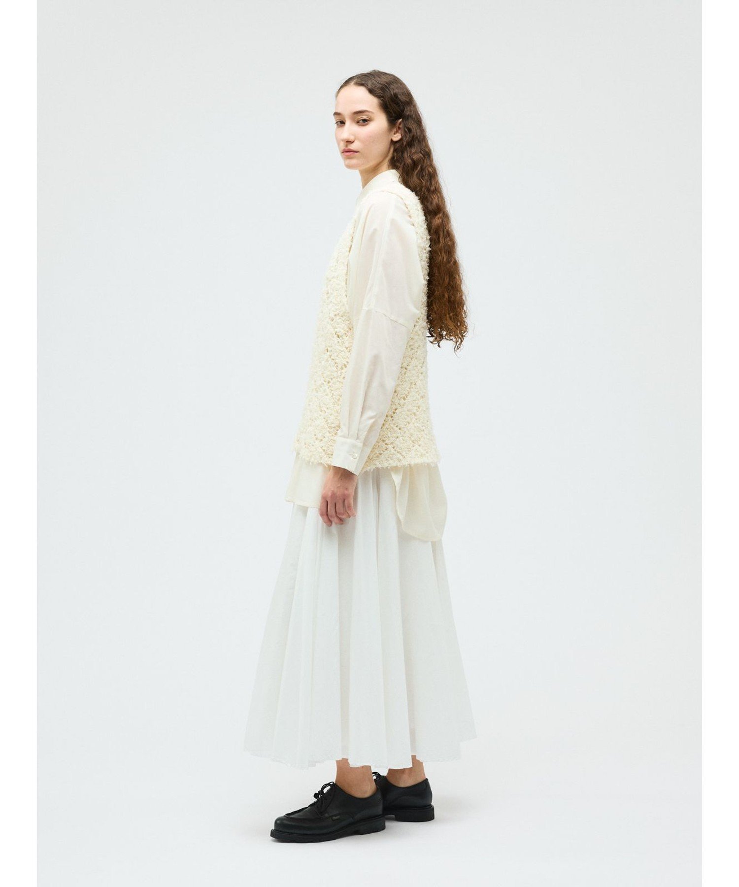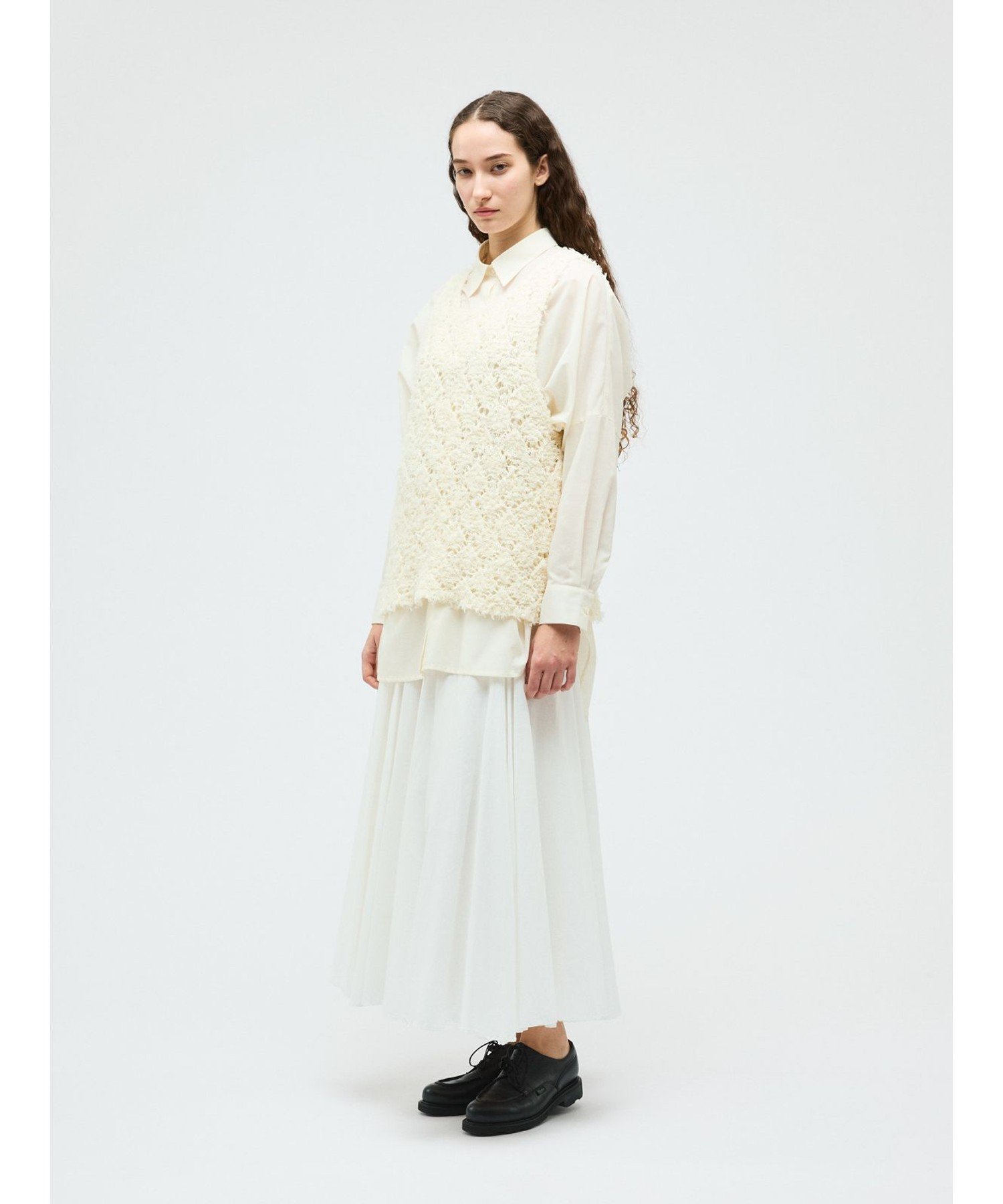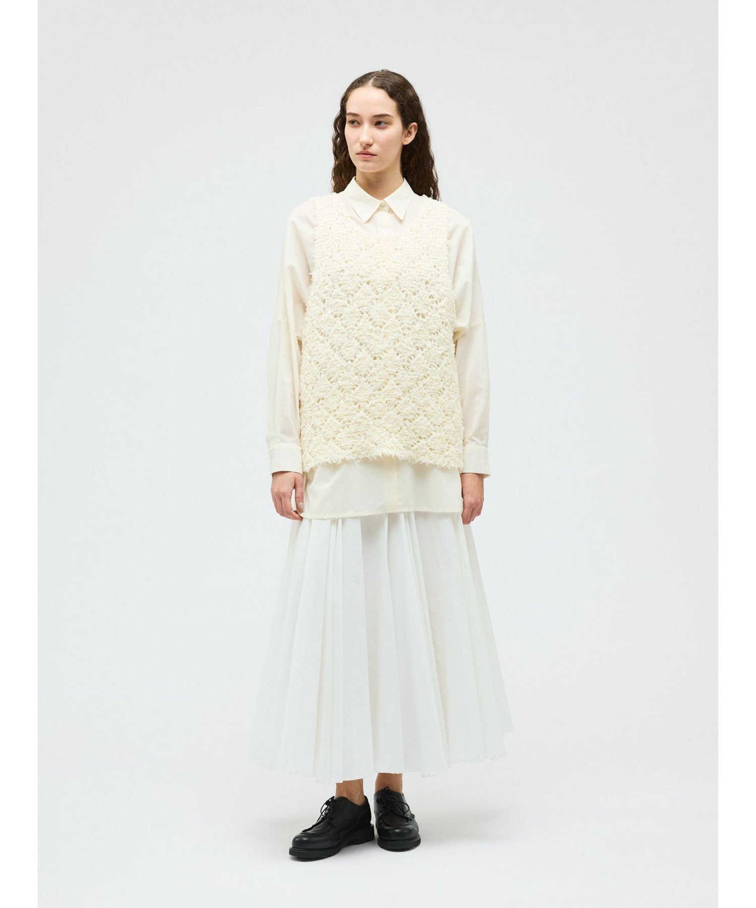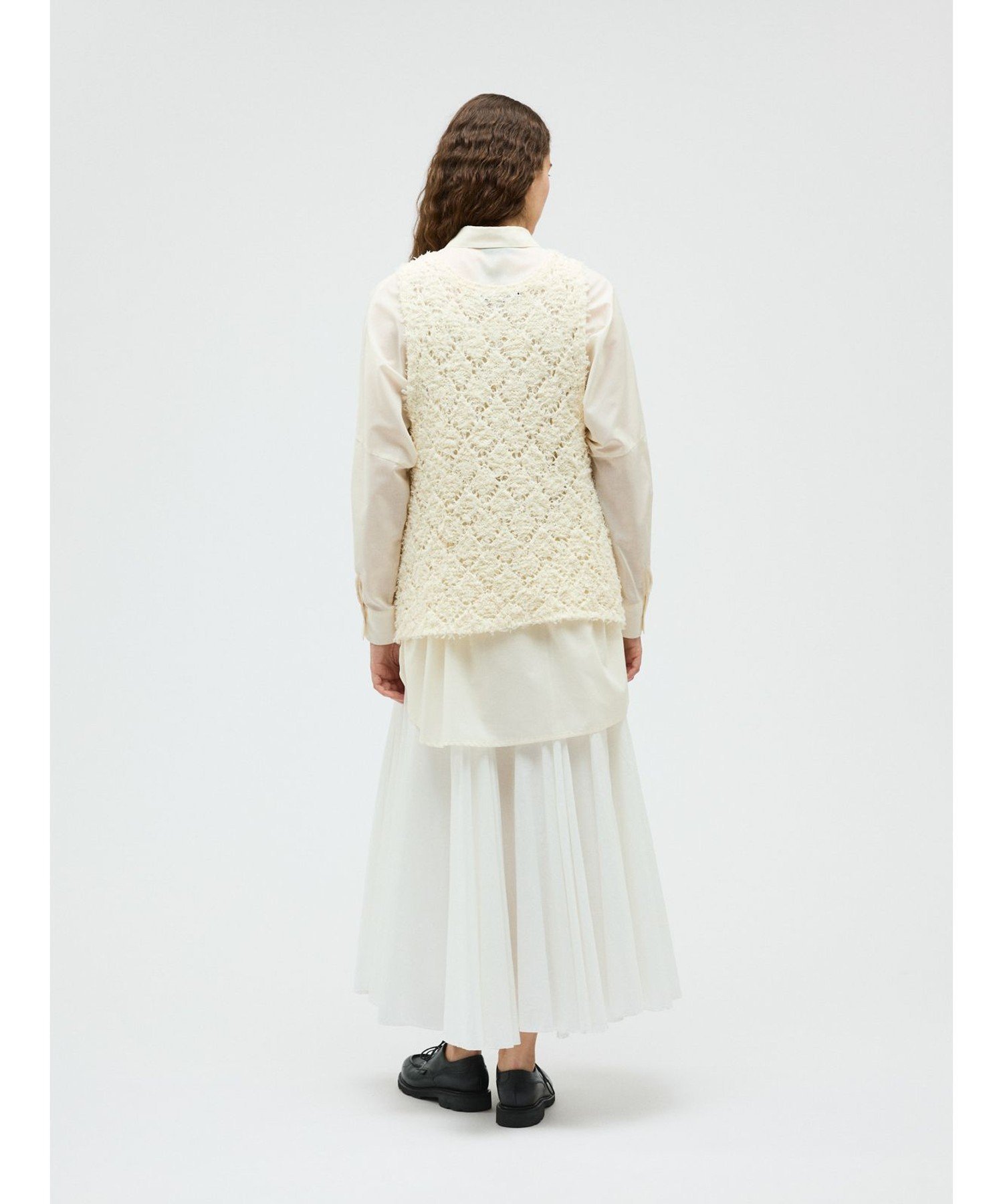 Этот жилет с узором связан из пряжи с бахромой в виде ромбов. Он создает полупрозрачный, трехмерный эффект. Ромбовидный узор ткани подчеркивается цветом внутреннего слоя. Эта оригинальная ткань делает многослойность привлекательной, даже в сочетании с внутренним слоем того же цвета. Длина жилета немного длиннее, чем до бедра. Широкие рукава облегчают надевание. Этот легкий трикотаж также можно стирать в машине.