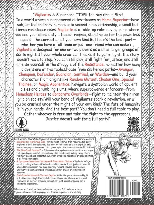 В мире, где сверхсильная элита - известная как Homo Superior - поработила обычных людей, превратив их во второсортных граждан, поднимается небольшое, но яростное сопротивление. Vigilante - это настольная ролевая игра, в которой вы и ваши союзники бросаете вызов фашистскому режиму, защищая беззащитных от коррупции со стороны себе подобных.