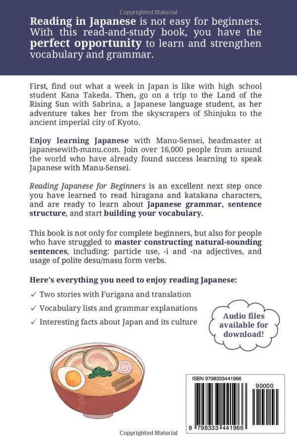 Эта книга станет отличным следующим шагом после того, как вы научитесь читать символы хираганы и катаканы и будете готовы изучать японскую грамматику, структуру предложений и начать пополнять свой словарный запас.