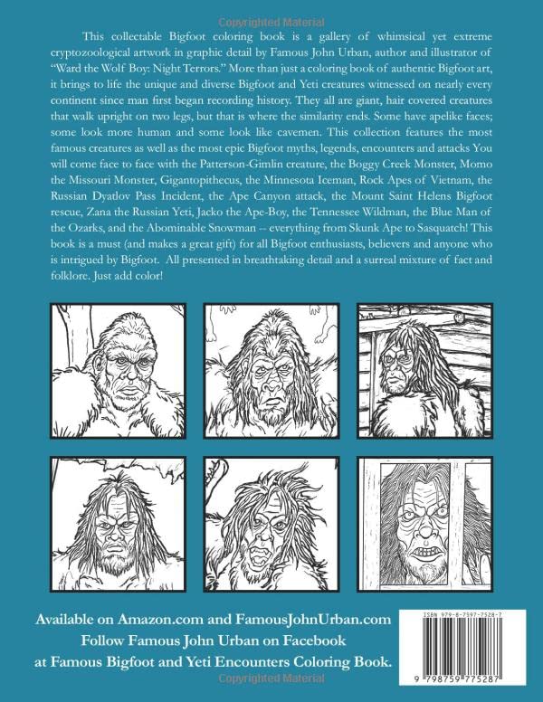 Эта коллекционная раскраска с изображением Бигфута представляет собой галерею причудливых, но в то же время экстремальных криптозоологических иллюстраций, выполненных в графической детализации известным Джоном Урбаном, автором и иллюстратором книги «Уорд, мальчик-волк: Ночные кошмары». Это не просто раскраска с подлинными изображениями Бигфута, она оживляет уникальных и разнообразных существ Бигфута и Йети, которых наблюдали почти на каждом континенте с тех пор, как человек начал вести летопись. Все они - гигантские, покрытые шерстью существа, которые ходят прямо на двух ногах, но на этом сходство заканчивается. У некоторых обезьяноподобные лица; некоторые выглядят более человечно, а некоторые - как пещерные люди. В этой коллекции собраны самые известные существа, а также самые эпические мифы, легенды, встречи и нападения Бигфута. Вы встретитесь лицом к лицу с существом Паттерсона-Гимлина, монстром из Богги-Крик, Момо, монстром из Миссури, гигантопитеком, ледяным человеком из Миннесоты, скальными обезьянами Вьетнама, инцидентом на перевале Дятлова, нападением в Обезьяньем каньоне, спасением Бигфута на горе Сент-Хеленс, Заной, русским йети, Джеко, мальчиком-обезьяной, дикарем из Теннесси, Синим человеком из Озарков и снежным человеком - со всем, от Скунсовой обезьяны до Сасквоча! Эта книга обязательна к прочтению (и станет отличным подарком) для всех энтузиастов Бигфута, верующих и всех, кто заинтригован Бигфутом. Все представлено в захватывающих деталях и сюрреалистической смеси фактов и фольклора. Просто добавьте красок!