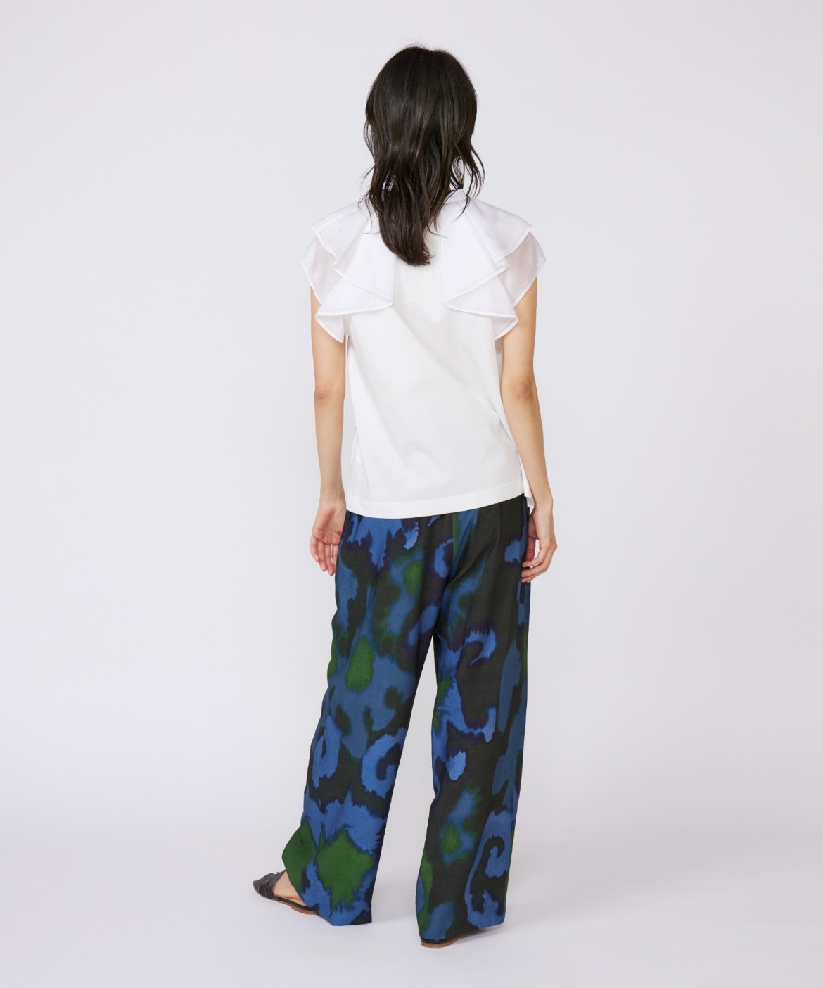 Трикотажная блузка с воротником-рюшами. Рюши вокруг шеи плавно переходят в рукава с рюшами, колыхаясь при каждом движении и создавая женственный образ. Разрез по центру спереди облегчает надевание и снимание.