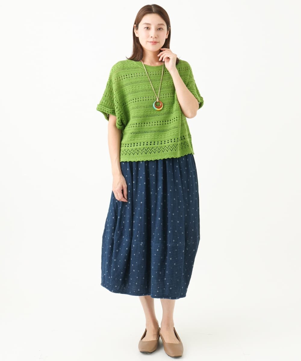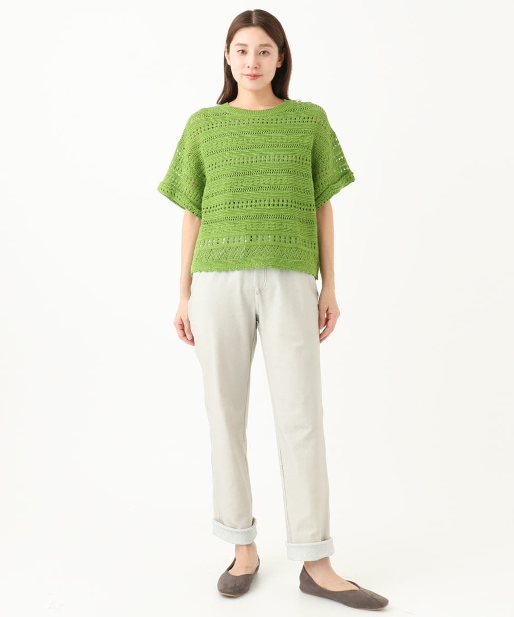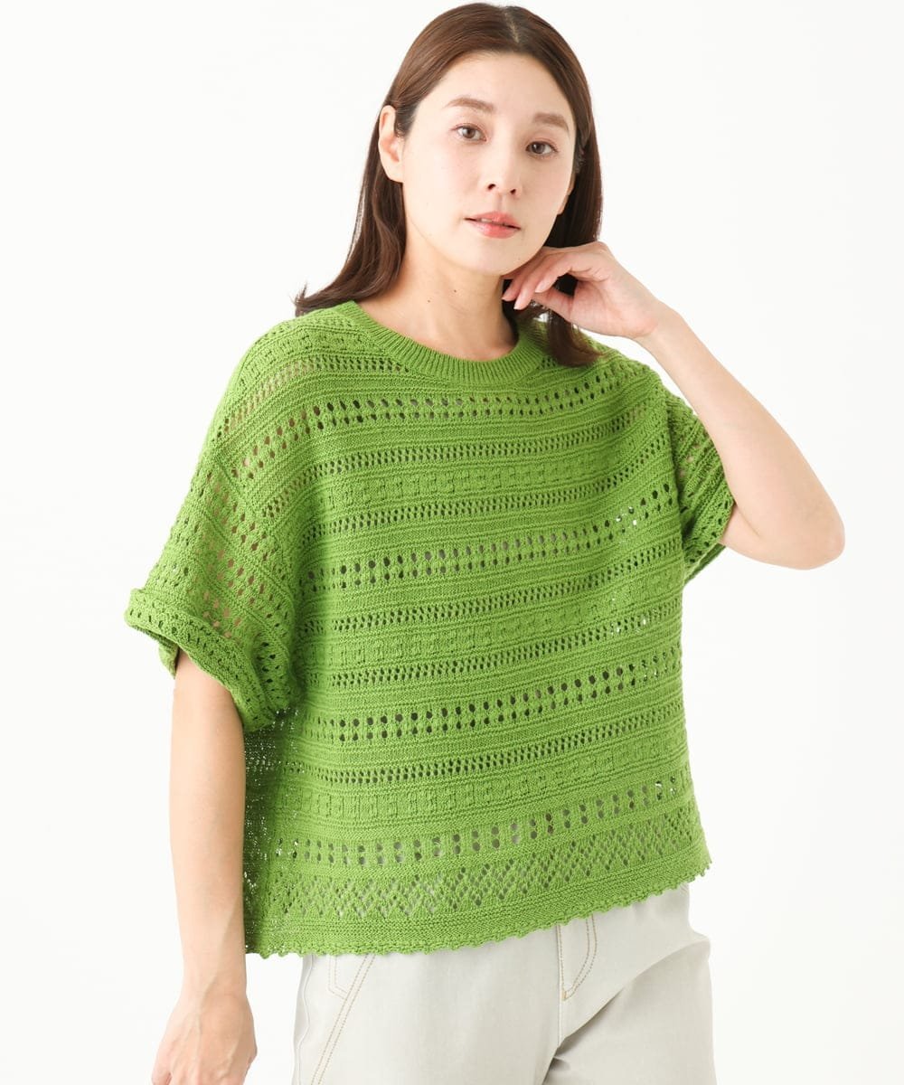 Пуловер из 100% хлопка, связанный крючком, с приятной, освежающей текстурой.