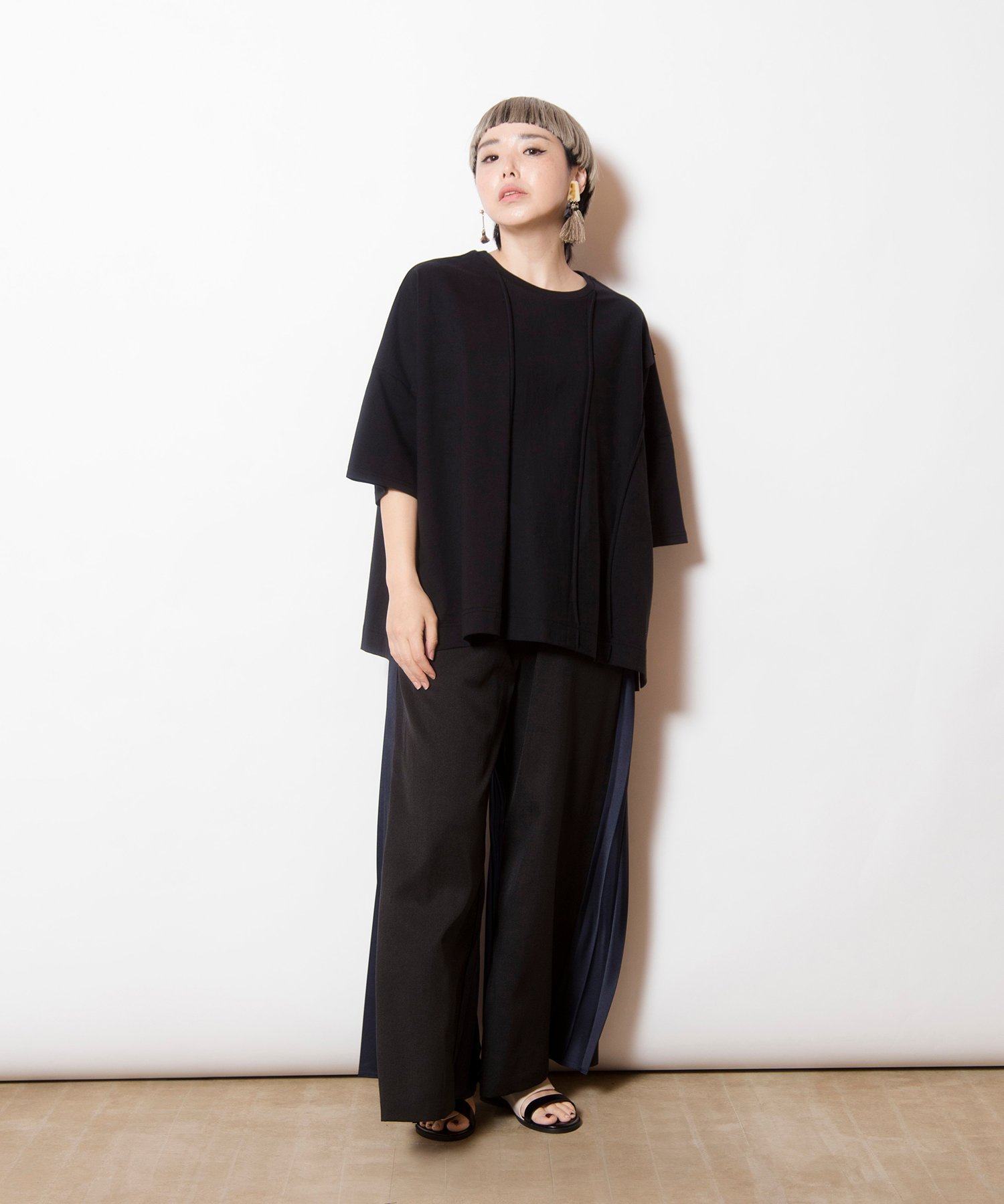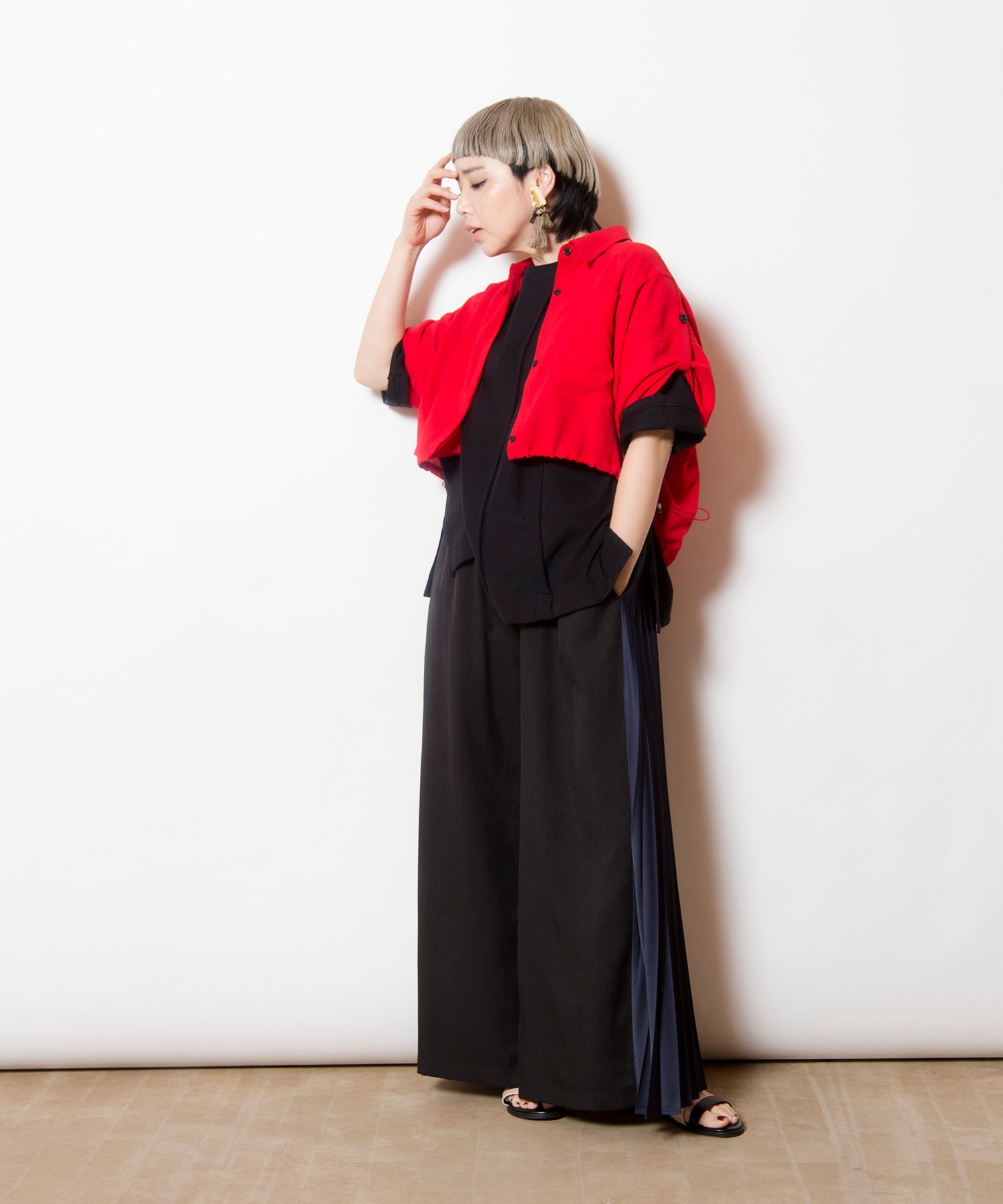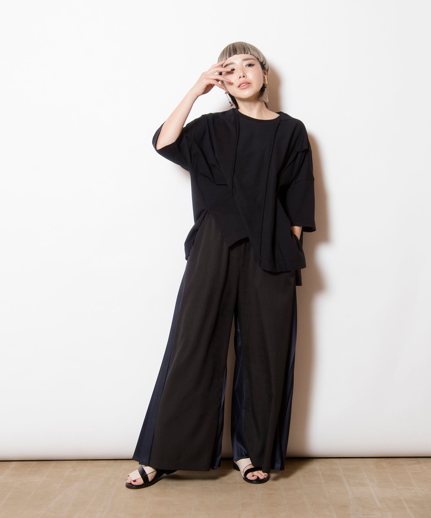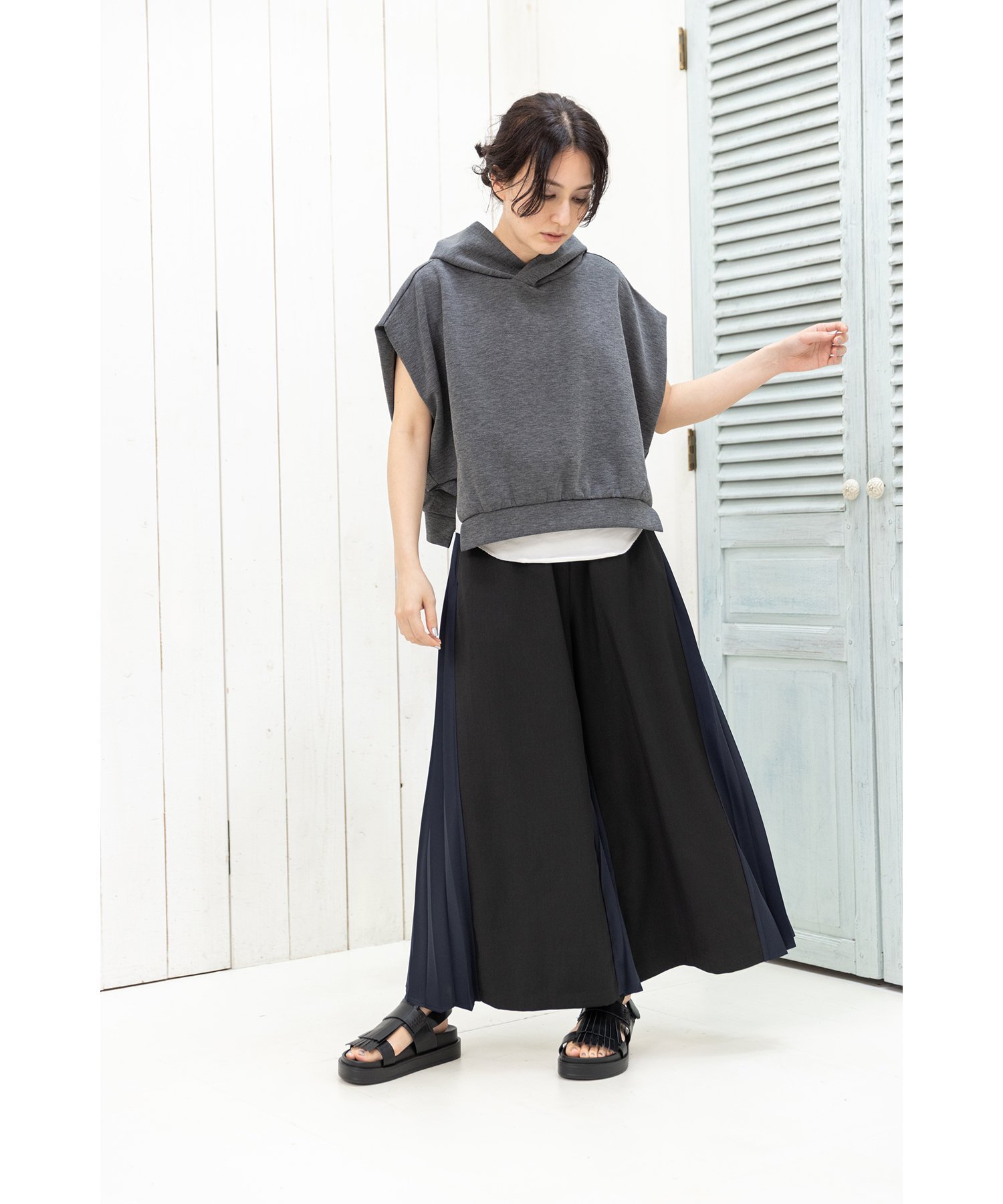 Свободный, широкий силуэт подчеркнут четкими складками, создающими эффект стройности.