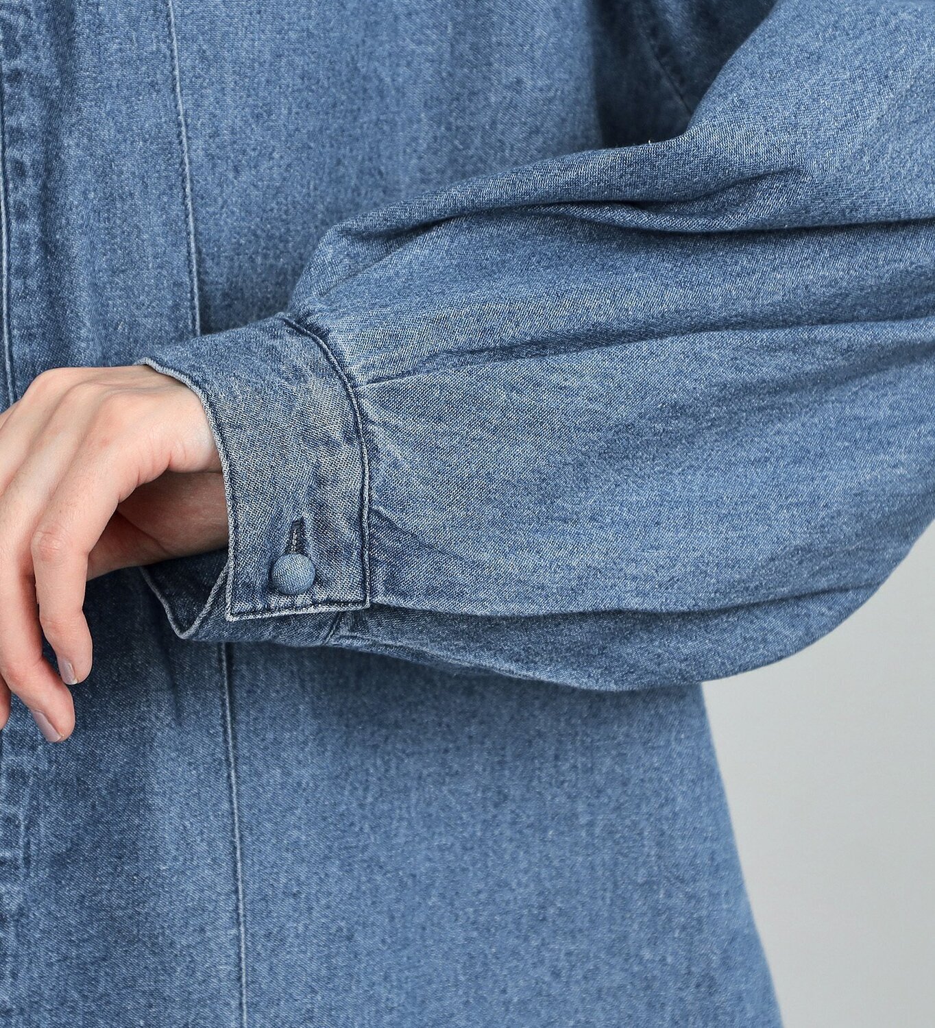 Изготовлена из 100% хлопкового денима, мягкого и приятного на ощупь. Пуговицы выполнены из тщательно отобранного орехового дерева. Рукава свободные, пышные. Лента съемная, что позволяет легко комбинировать вещи, что является еще одним большим плюсом.