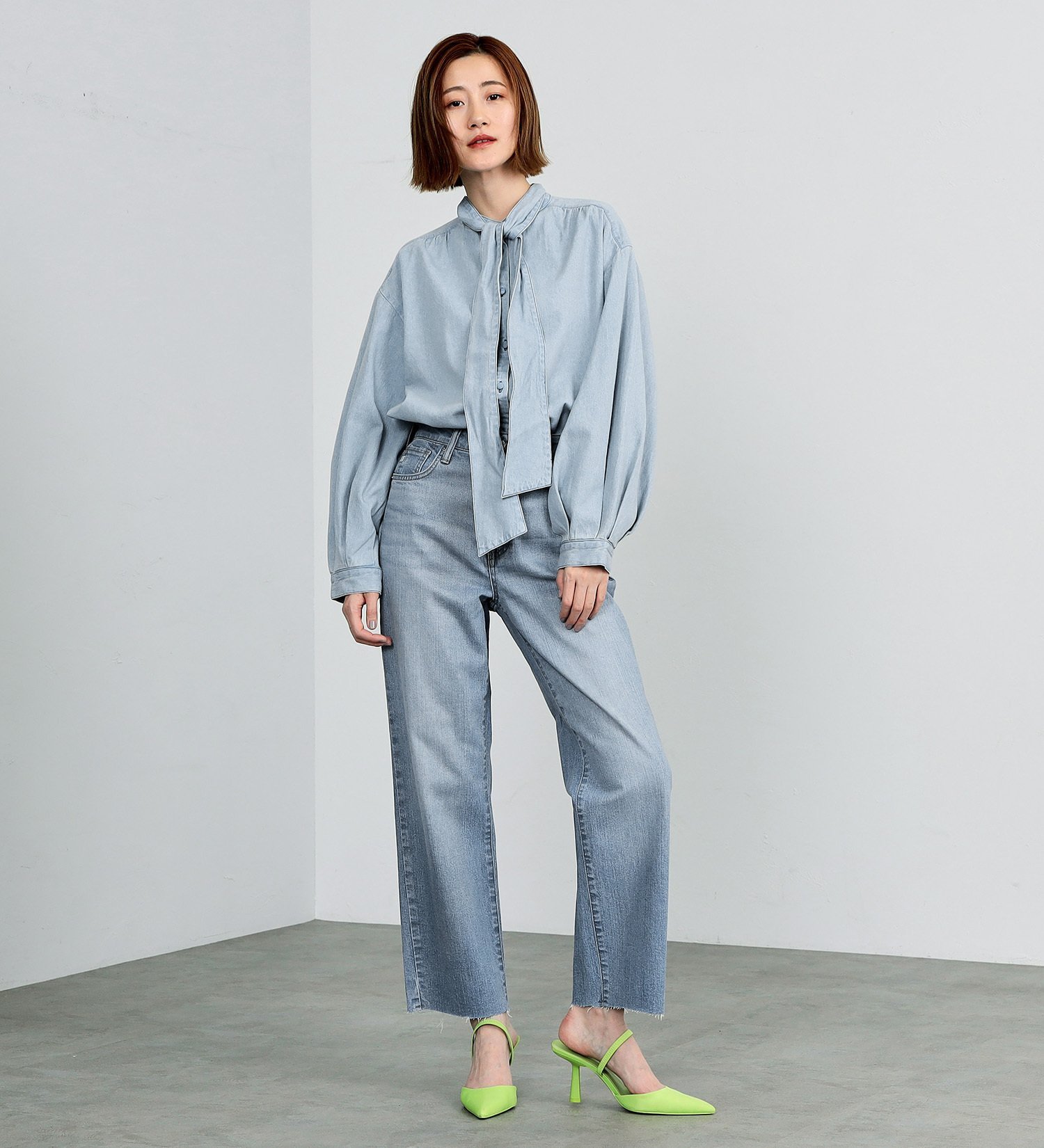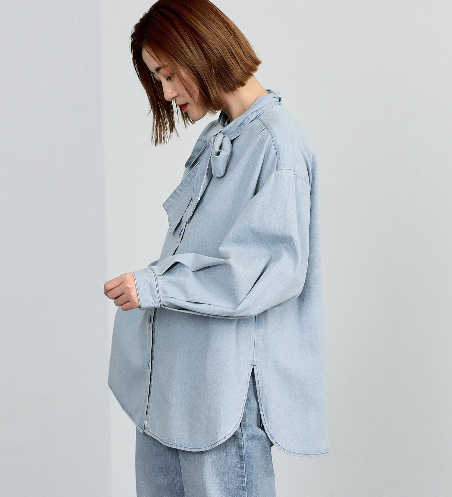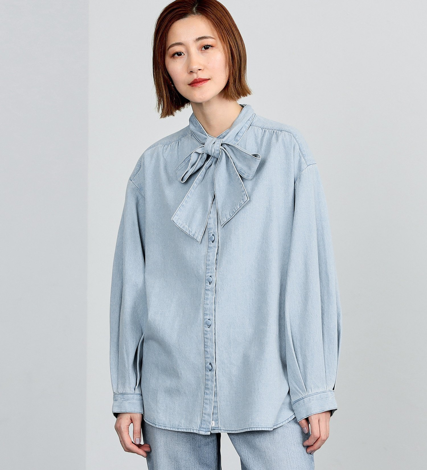 Блузка с бантом и большой джинсовой лентой в качестве изюминки.