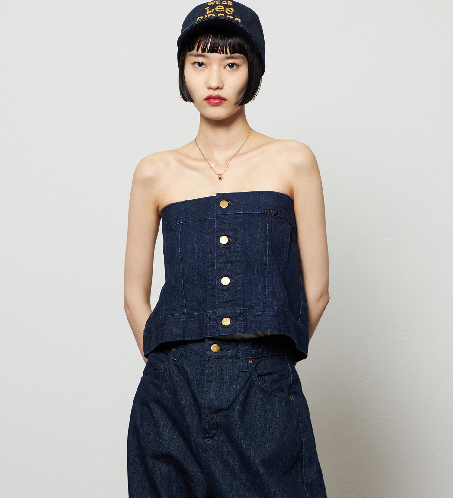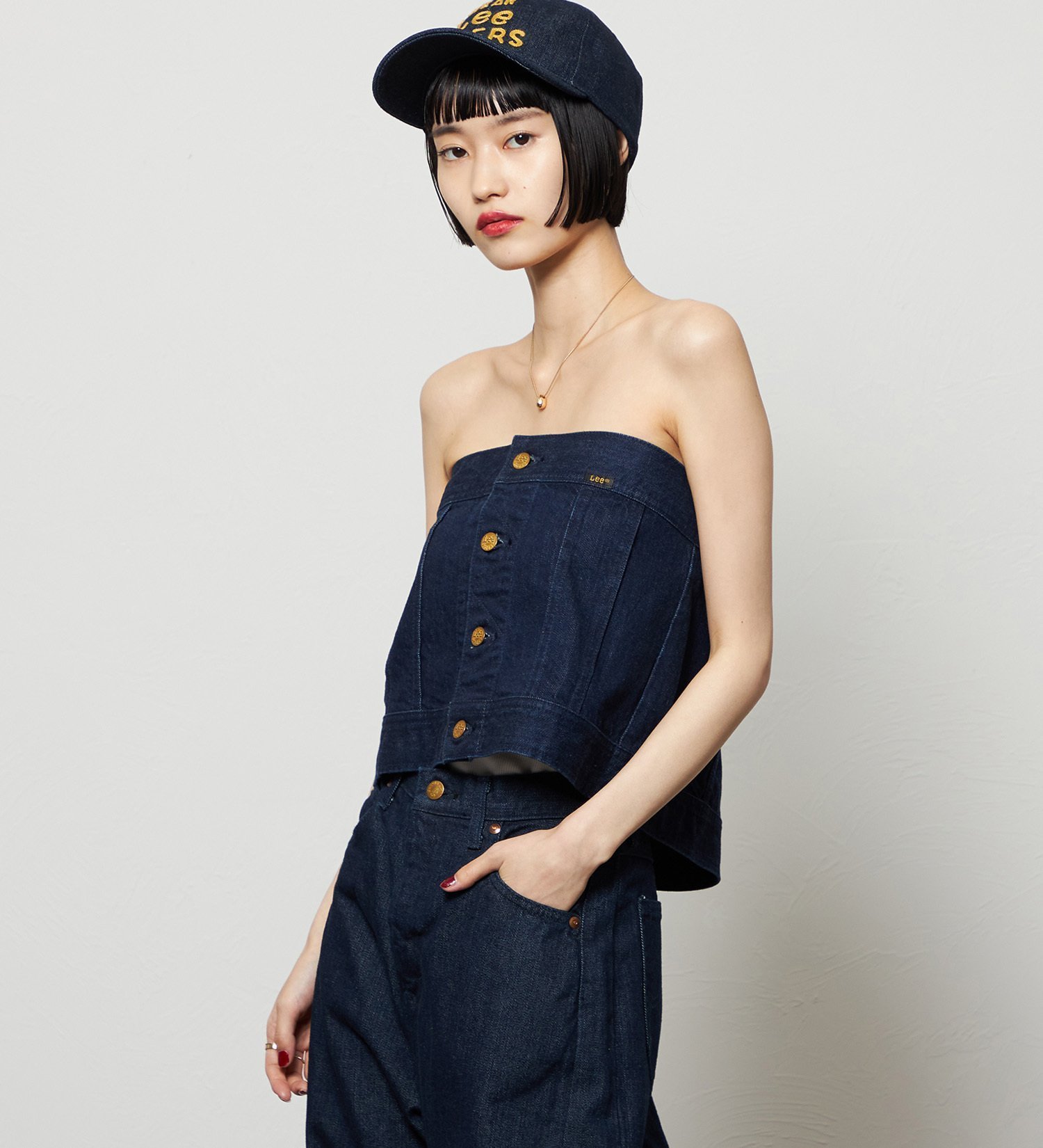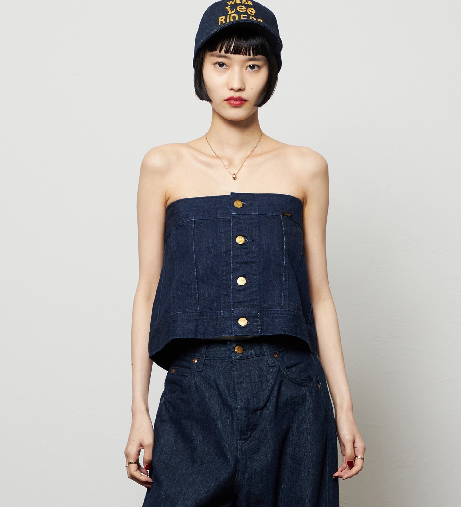 Этот дерзкий джинсовый бюстье сочетает в себе детали байкерской куртки.