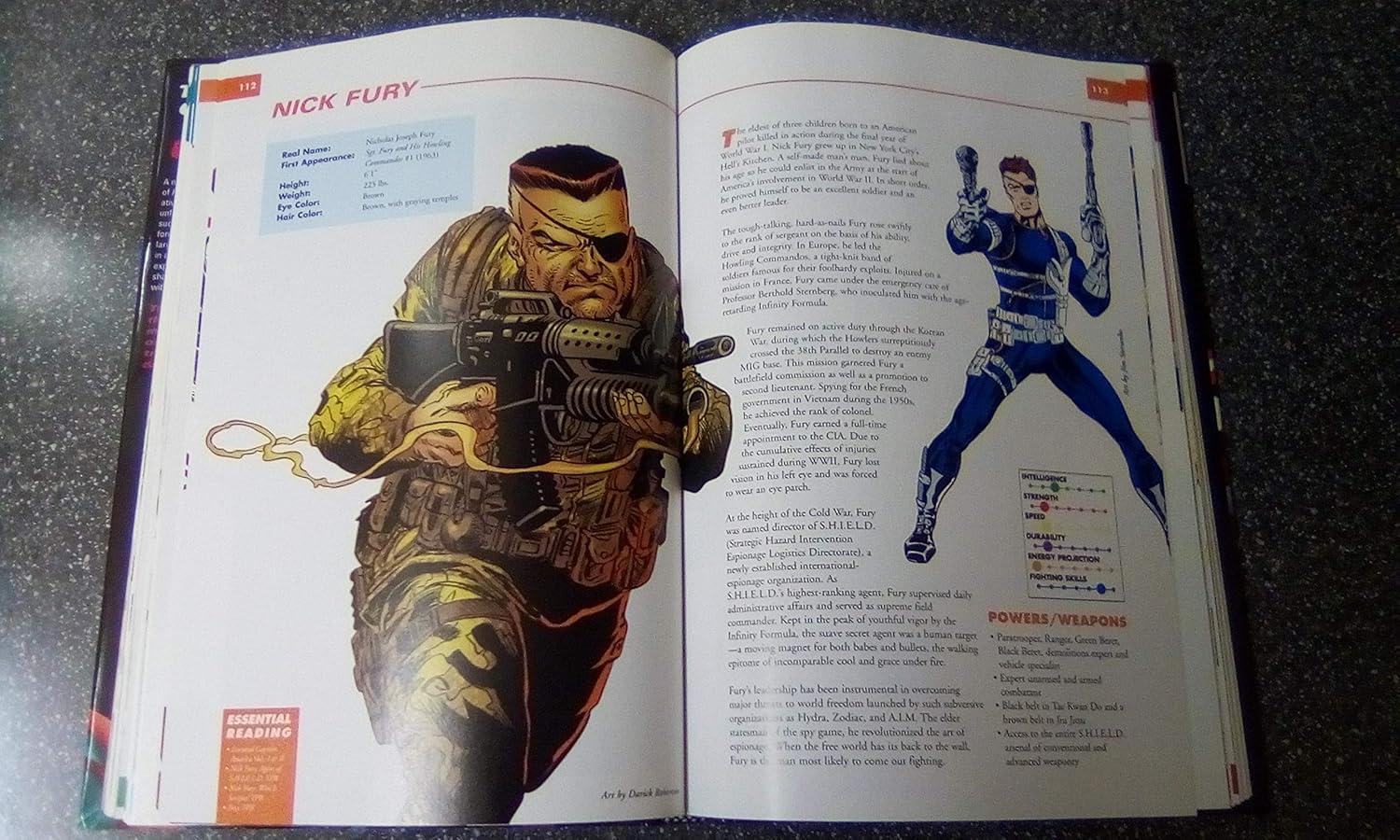 Содержит подробную информацию о внешности, способностях, союзах и личных историях героев и злодеев Marvel Comics, включая Капитана Америку, Халка, Красного Черепа, Блейда, Карателя, Джин Грей, Доктора Дума и Электру.