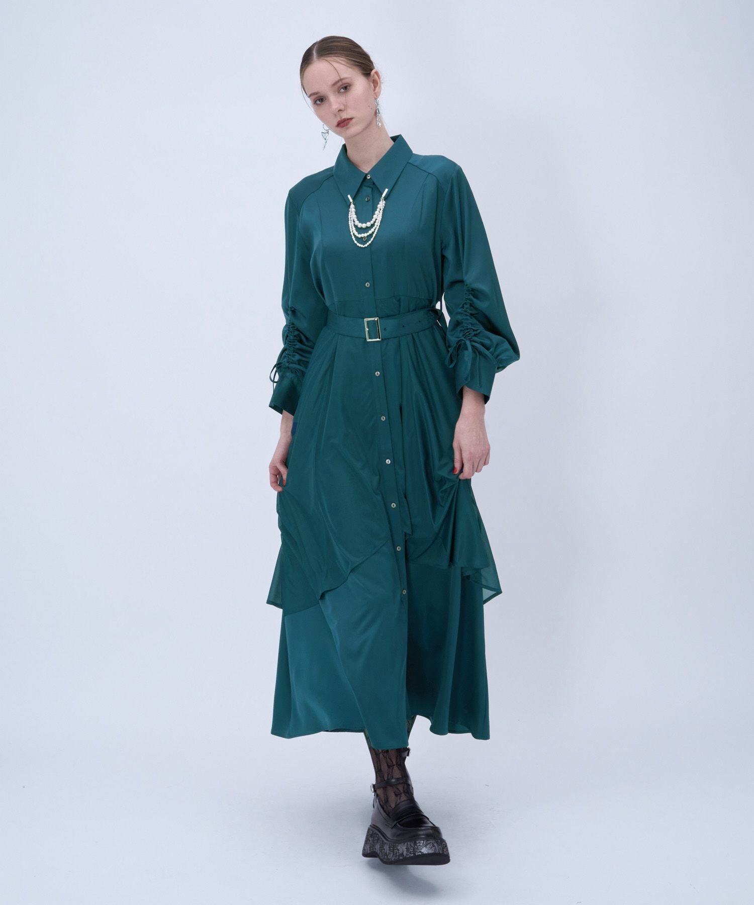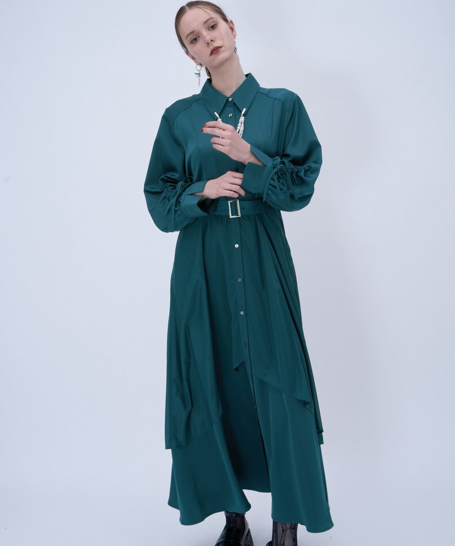 □Платье с элегантным дизайном, основанным на драпированной атласной ткани.