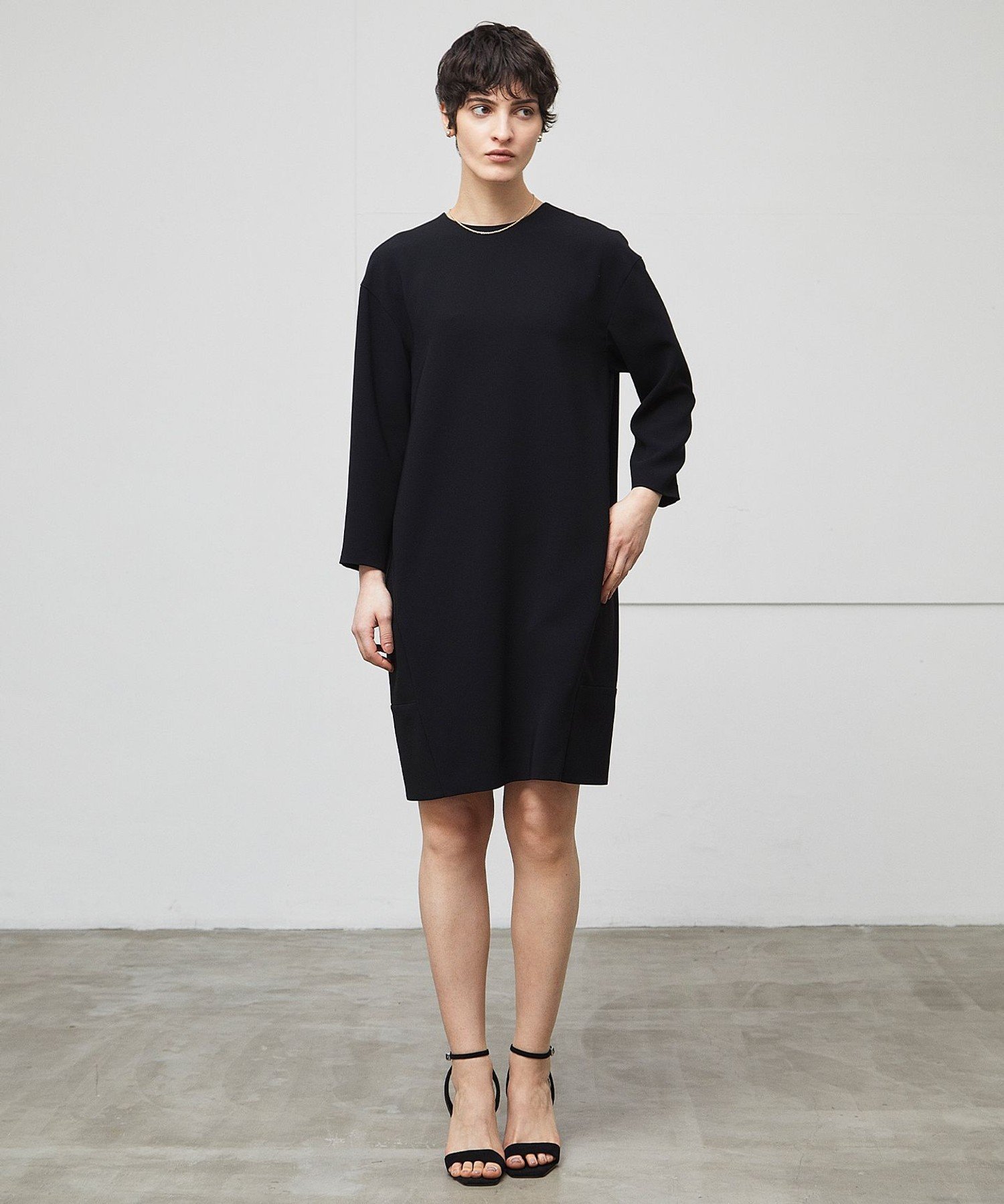 Это мини-платье-кокон облегает фигуру благодаря приспущенным плечам. Небольшой круглый вырез и рукава, открывающие запястья, создают гармоничный образ. Идеально подходит как само по себе, так и в сочетании с высокими сапогами и жакетом для более мужественного образа. Это платье идеально подходит для повседневного офисного стиля или любого особого случая. Черный струящийся материал создает изысканный образ для самых разных случаев.