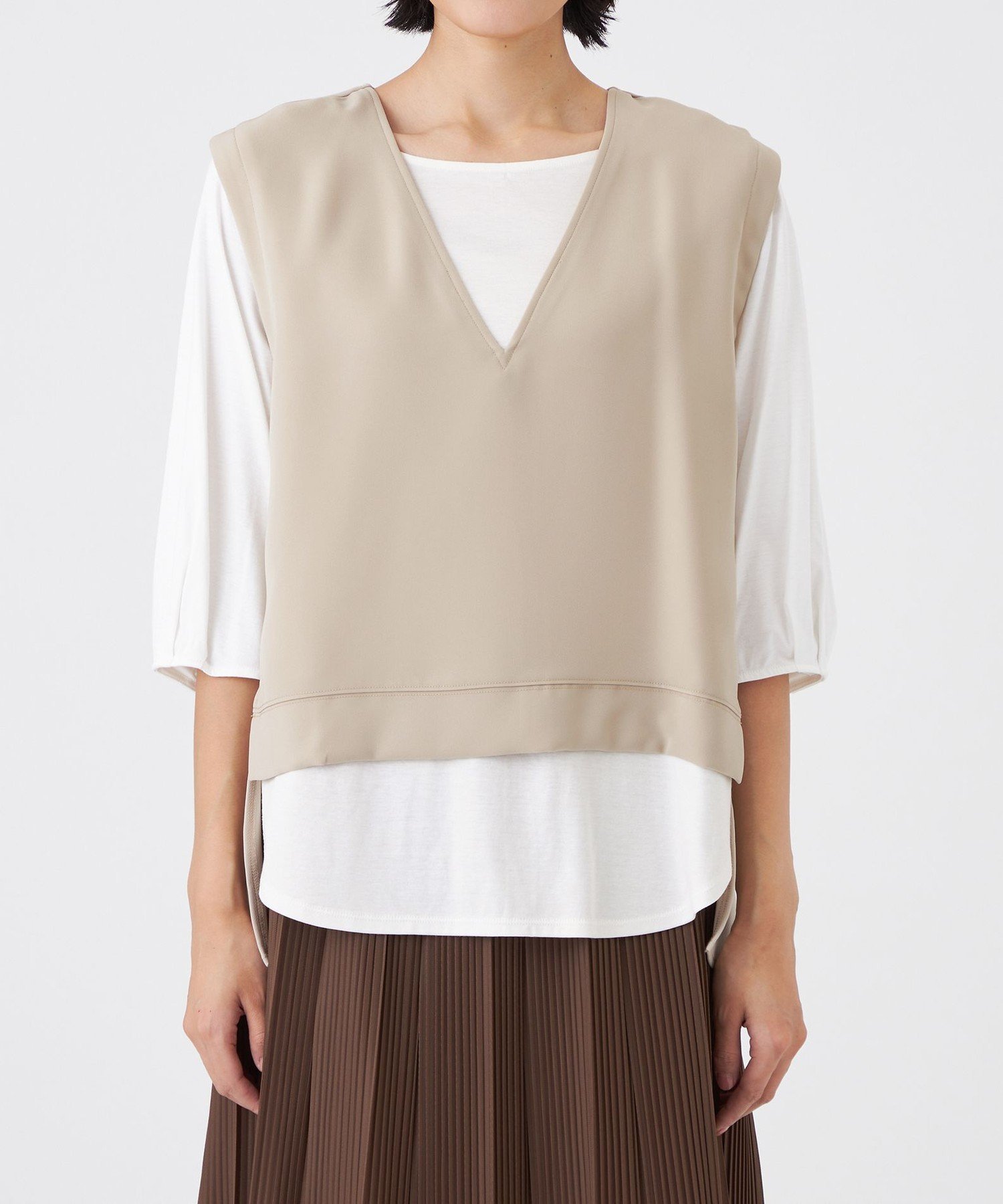 Этот пуловер сочетает в себе различные материалы, создавая впечатление жилета, надетого поверх другого. Свободный силуэт естественным образом облегает тело, а длина подола различается спереди и сзади, что придает ему изысканный вид. Сочетайте его с подходящими брюками (U1R03-643).