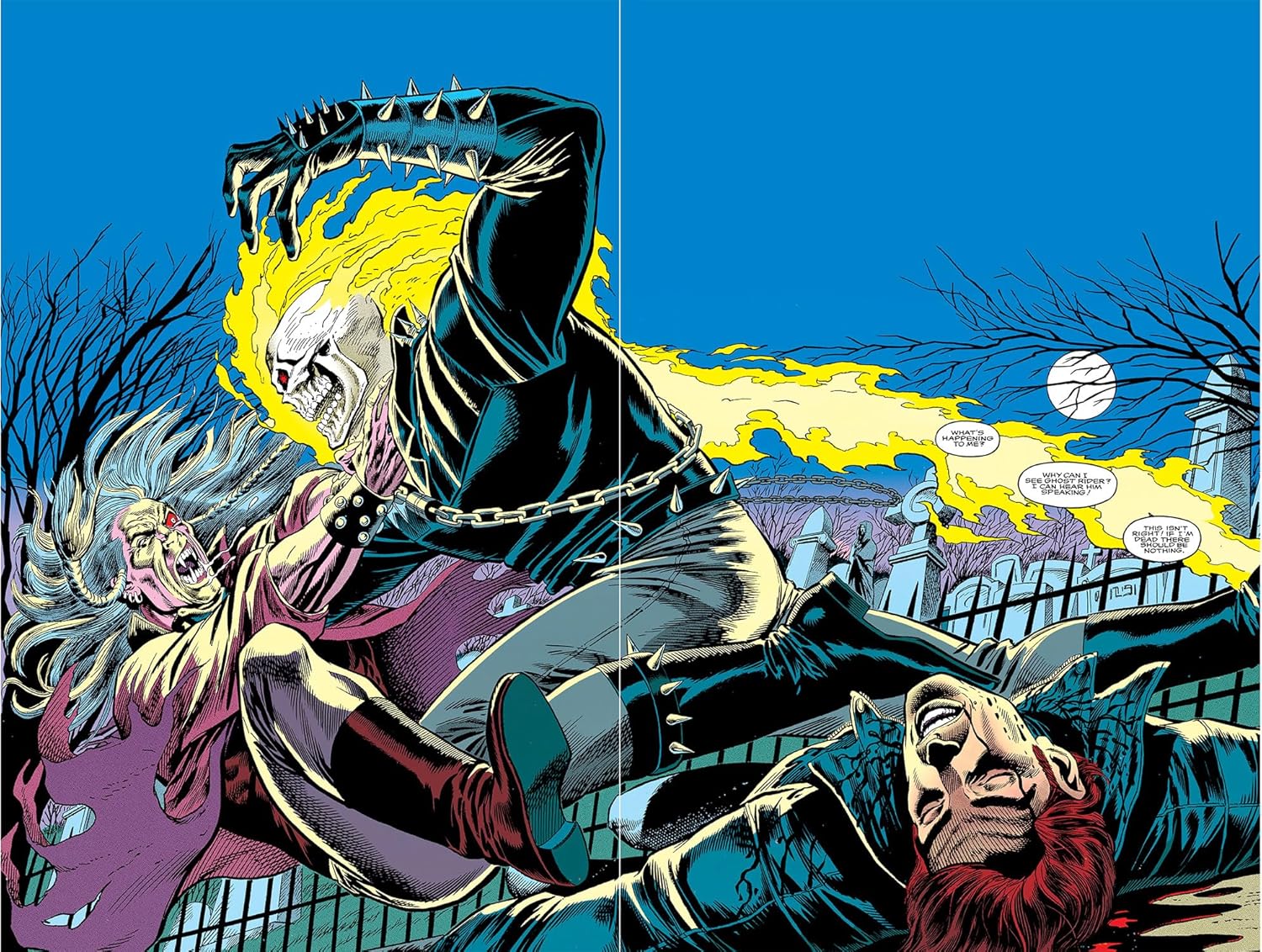 Дэнни Кетч и Джонни Блейз - Духи Возмездия! Захватывающие приключения Призрачного Всадника из 90-х продолжаются, и в них участвуют Джонни Блейз и восхождение «Полуночных Сынов» Marvel! Морбиус, Блэйд, Ночные Охотники и Искупители Даркхолда присоединяются к борьбе против Лилит, Матери Демонов, и ее ужасающего потомства! А Призрачный Всадник сражается с инопланетным Брудом вместе с Людьми Икс; познает страх вместе с Капитаном Америкой благодаря зловещему Пугалу; и участвует в адском объединении с Человеком-пауком - противостоя Веному, Демогоблину и многим другим! Плюс: Важные истории из мифологии Призрачного Всадника, которые никогда ранее не были собраны в одном сборнике!
