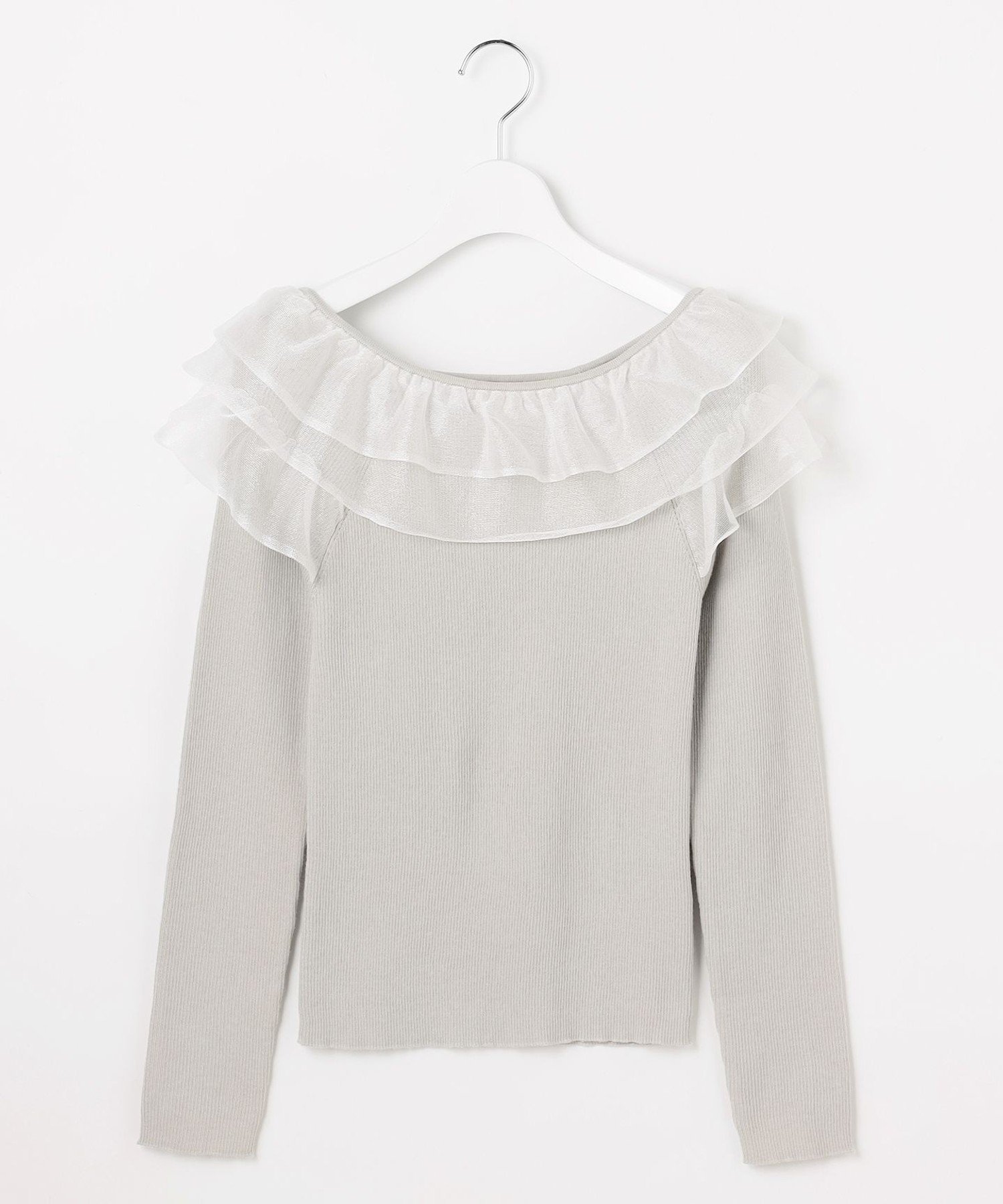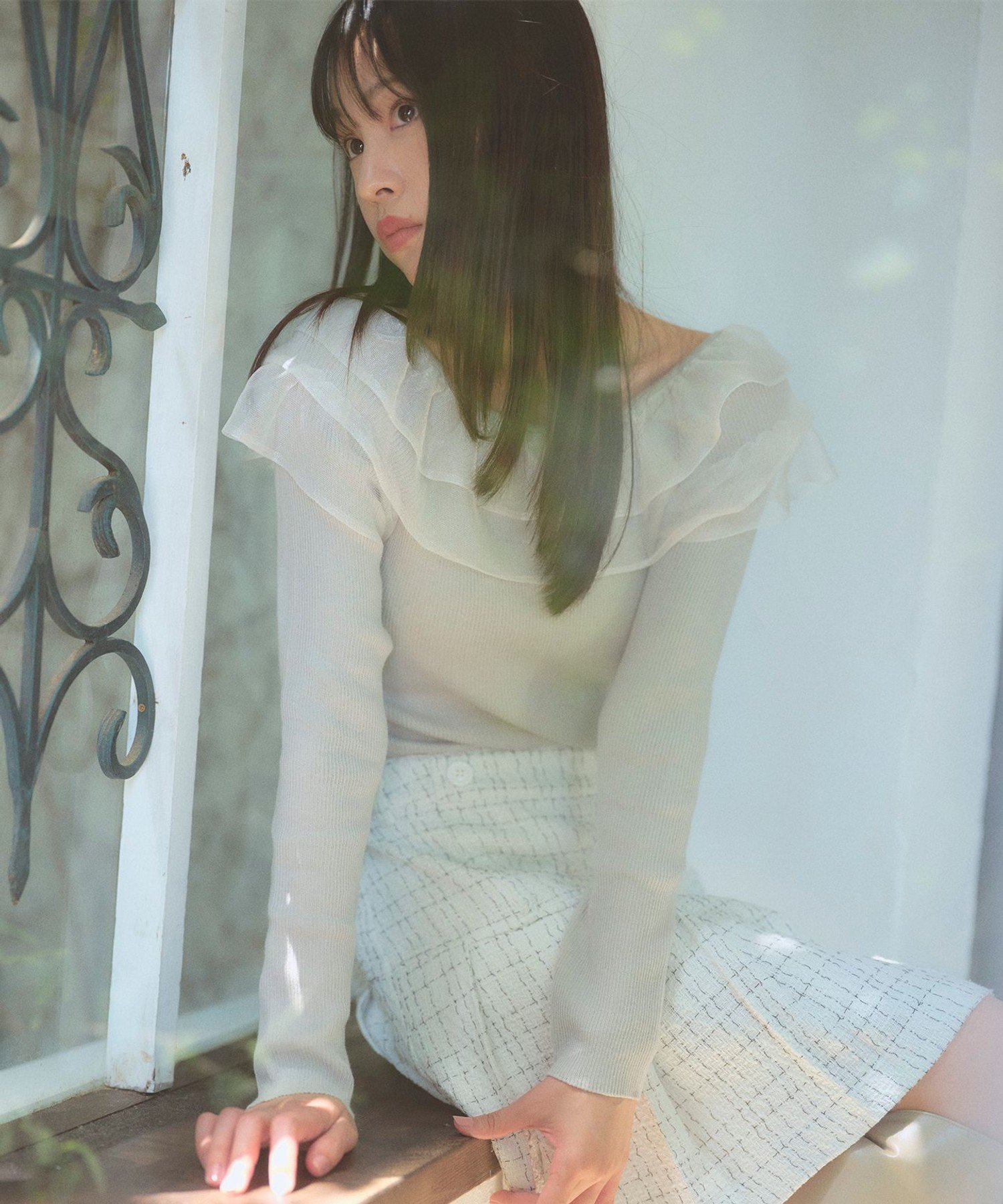Изысканный, женственный вязаный топ с привлекательными крупными оборками, которые красиво обрамляют лицо. Тюльевые оборки вокруг воротника мягко колышутся, добавляя гламура лицу. Умеренно компактный силуэт придает верхней части тела аккуратный вид, позволяя изысканно подчеркнуть нежность оборок. Это универсальная вещь, которую можно носить как с юбками, так и с брюками, но при этом она достаточно гламурна, чтобы быть в центре внимания и сама по себе.