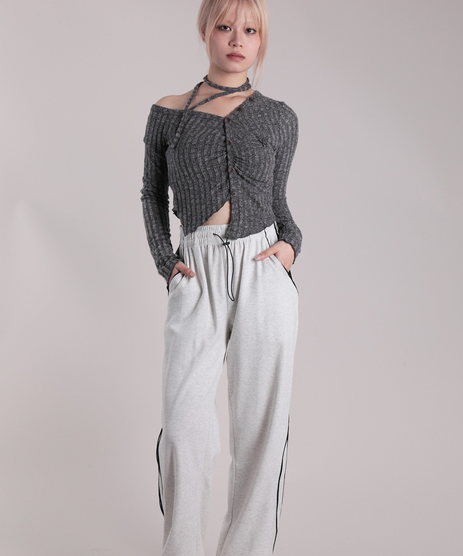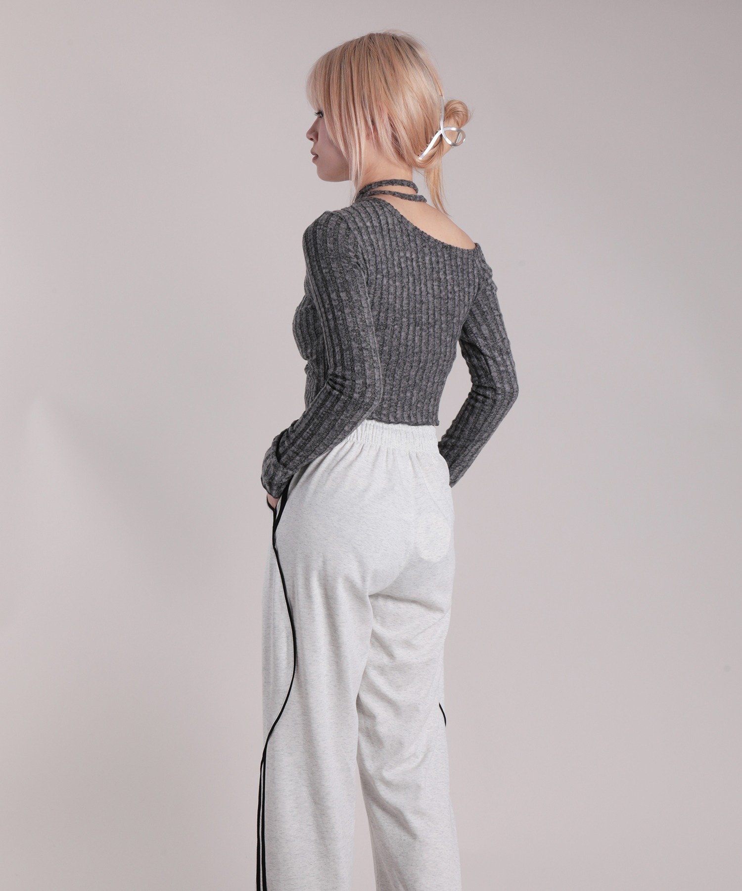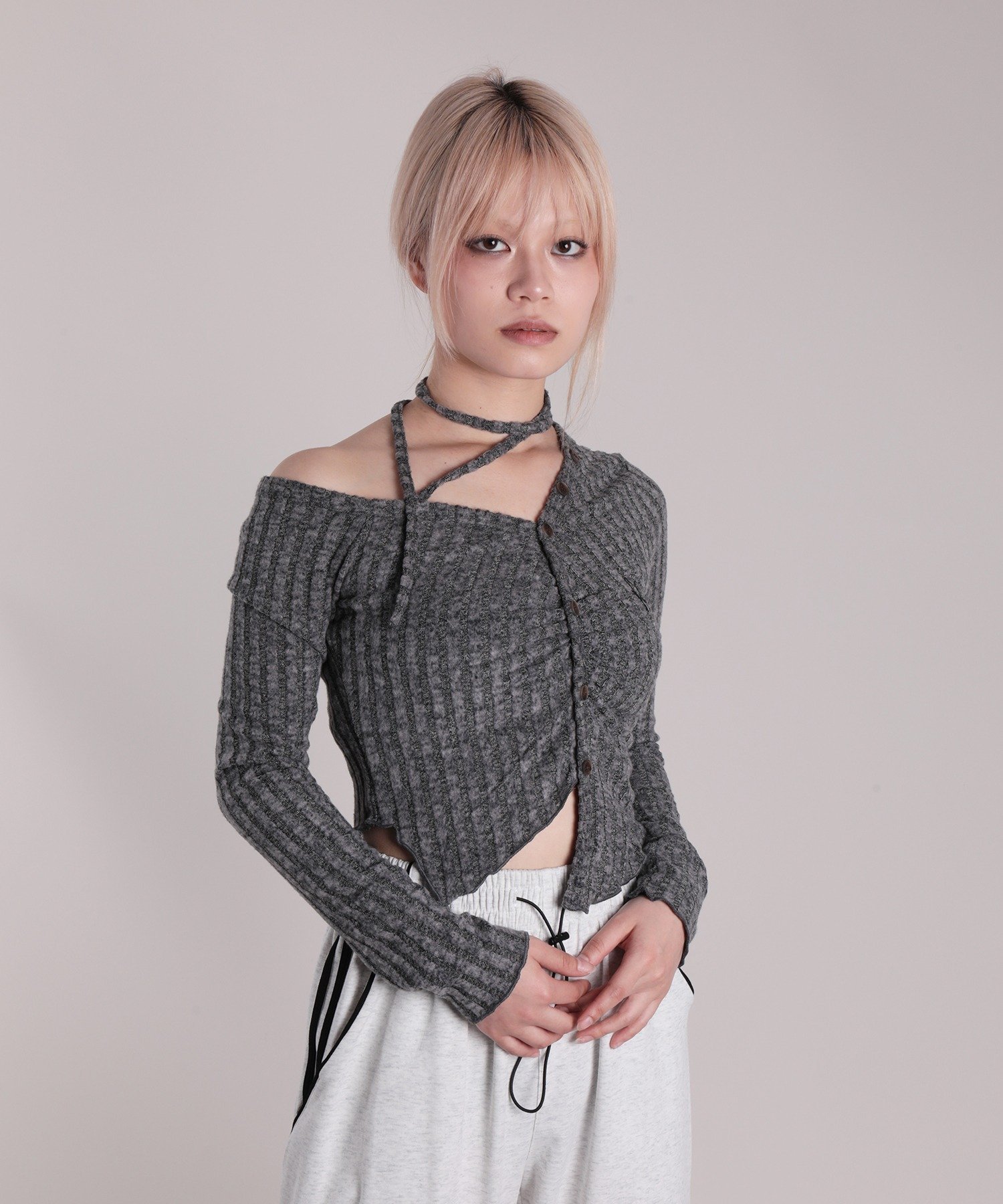 Асимметричная трикотажная рубашка с открытыми плечами, одновременно женственная и стильная.