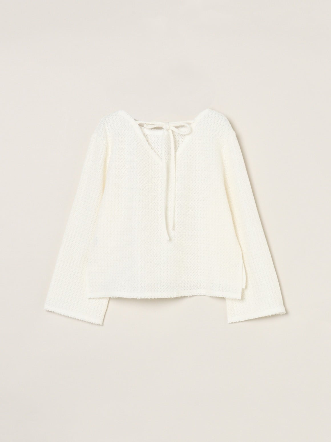 Кружевной топ, связанный на вязаном станке Russell. Открытая спинка и лента сзади делают его уникальным изделием, которое можно рассмотреть сзади. Он легкий и модный, но не слишком прозрачный, поэтому его можно носить как толстовку. Необработанный край подола придает ему весенне-летний вид, но в сочетании с топом с высоким воротником, связанным на вязаном станке, он создаст универсальный образ, подходящий для любого времени года. Также доступен топ с круглым вырезом из того же материала, который больше похож на толстовку.