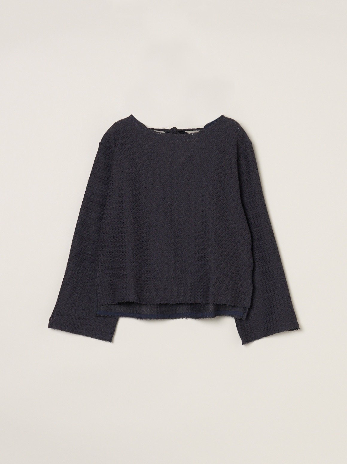 Кружевной топ, связанный на вязаном станке Russell. Открытая спинка и лента сзади делают его уникальным изделием, которое можно рассмотреть сзади. Он легкий и модный, но не слишком прозрачный, поэтому его можно носить как толстовку. Необработанный край подола придает ему весенне-летний вид, но в сочетании с топом с высоким воротником, связанным на вязаном станке, он создаст универсальный образ, подходящий для любого времени года. Также доступен топ с круглым вырезом из того же материала, который больше похож на толстовку.