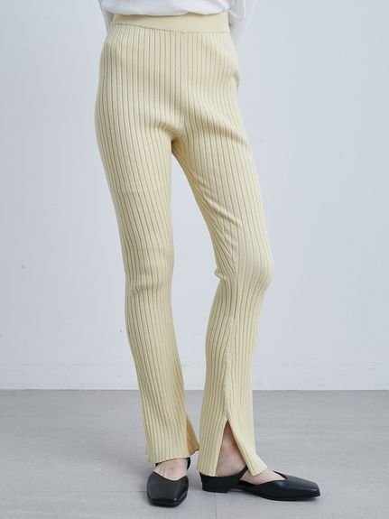 Ширина ребристой вязки тщательно разработана, чтобы визуально стройнить ноги, а расклешенный силуэт, расширяющийся к низу, создает красивый силуэт ног.