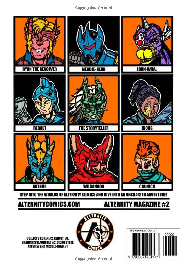 Alternity Magazine #2 - это комикс-журнал, в котором представлены несколько выпусков Alternity Comic. В этот журнал вошли Roken #2, Rebolt #0, Drahcir's Slaughter #1, превью Sicko State, а также короткий рассказ о Meddle-Head #1.