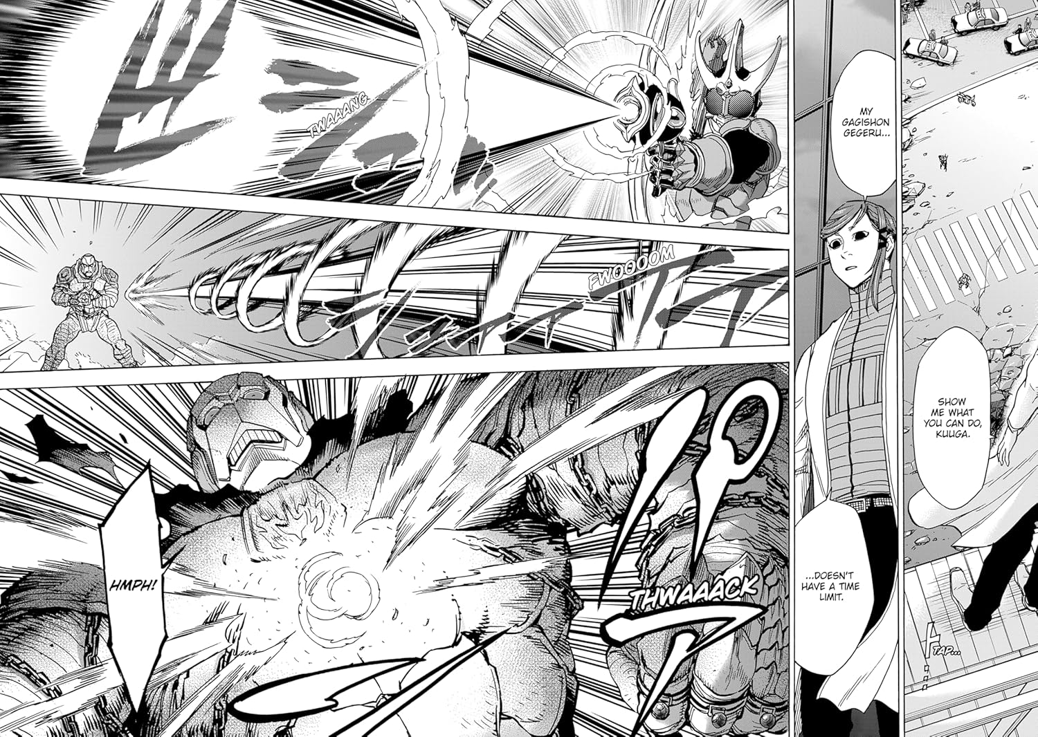 В 11 томе «Камен Райдер Кууга» битва с Гронги накаляется, поскольку за кулисами появляется новая, таинственная сила. По мере того, как смертоносная игра Гронги («гегеру») обостряется, появляется могущественный класс Гамэго, несущий с собой всепоглощающее чувство обреченности. Но дело не только в монстрах…