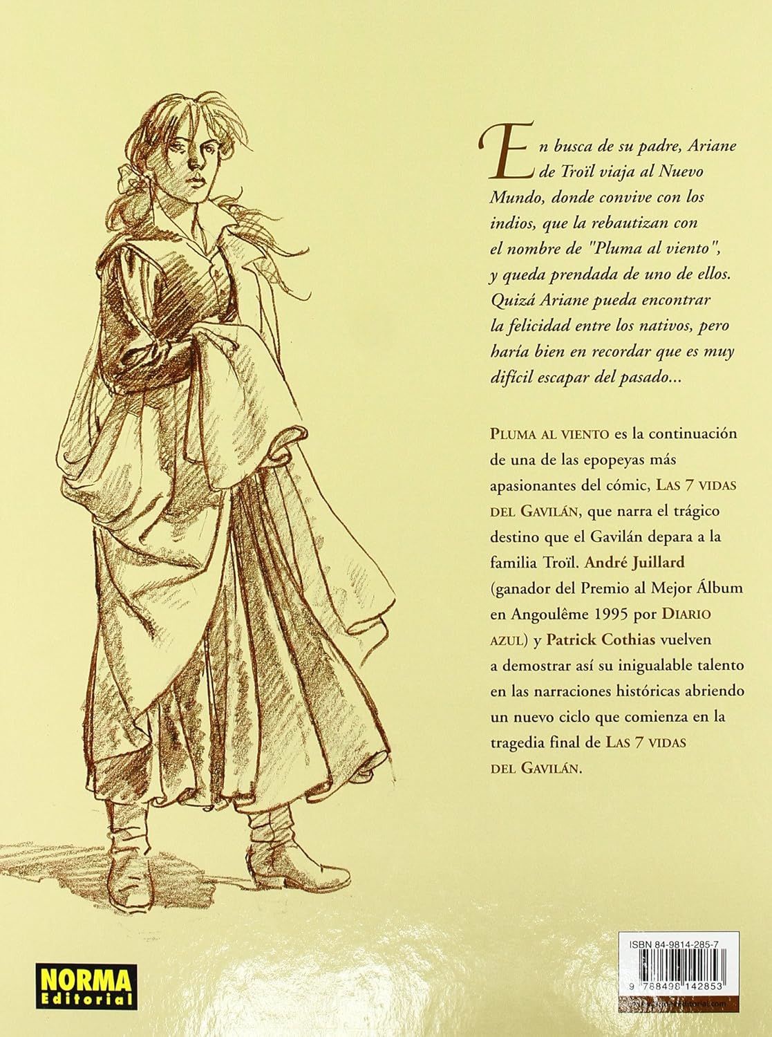 PLUMA AL VIENTO - это продолжение самых больших комических эпох, LAS 7 VIDAS DEL GAVILAN, который рассказывает о трагической судьбе, которую Гавилан ушел из семьи Троила. Андре Жюйяр (постановщик премии «Лучший альбом в Ангулеме», 1995 г., изданный в «EL DIARIO AZUL») и Патрик Котиас являются демонстраторами своего необъяснимого таланта в исторических повествованиях.