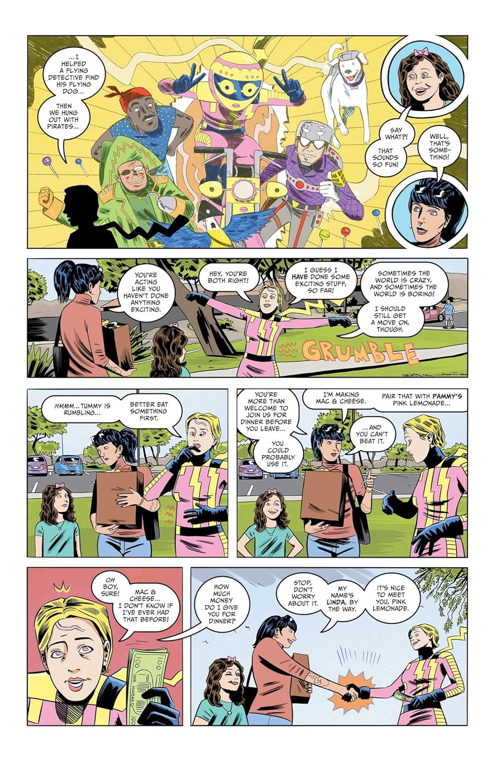 Загадочное прошлое! Яркий костюм! Альтруистичный взгляд на жизнь! Задорный мотоцикл! И невероятно богатое воображение! Знакомьтесь, Розовая Лимонад - новая героиня! Она мечтает о больших свершениях, но в конечном итоге довольствуется лишь помощью, чем может. Но когда Розовая Лимонад случайно попадает на съемочную площадку следующего блокбастера Rex Radical, она неожиданно оказывается в центре внимания... и вскоре сталкивается с целой серией все более угрожающих двойников, инопланетных фанатов и коварных корпоративных интриг.