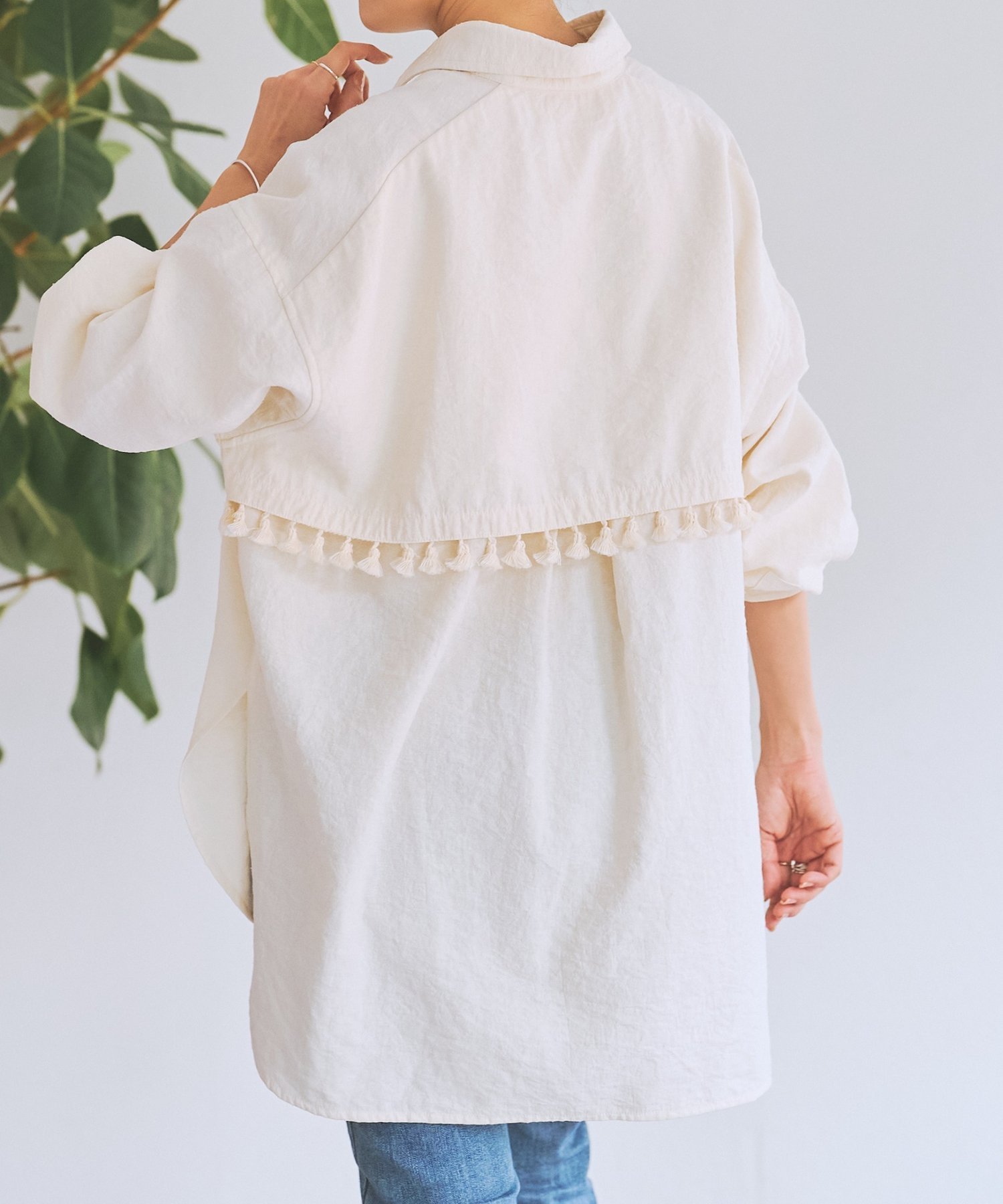 Кокетка на спине прошита двойным швом и украшена бахромой, что добавляет изысканности образу сзади.