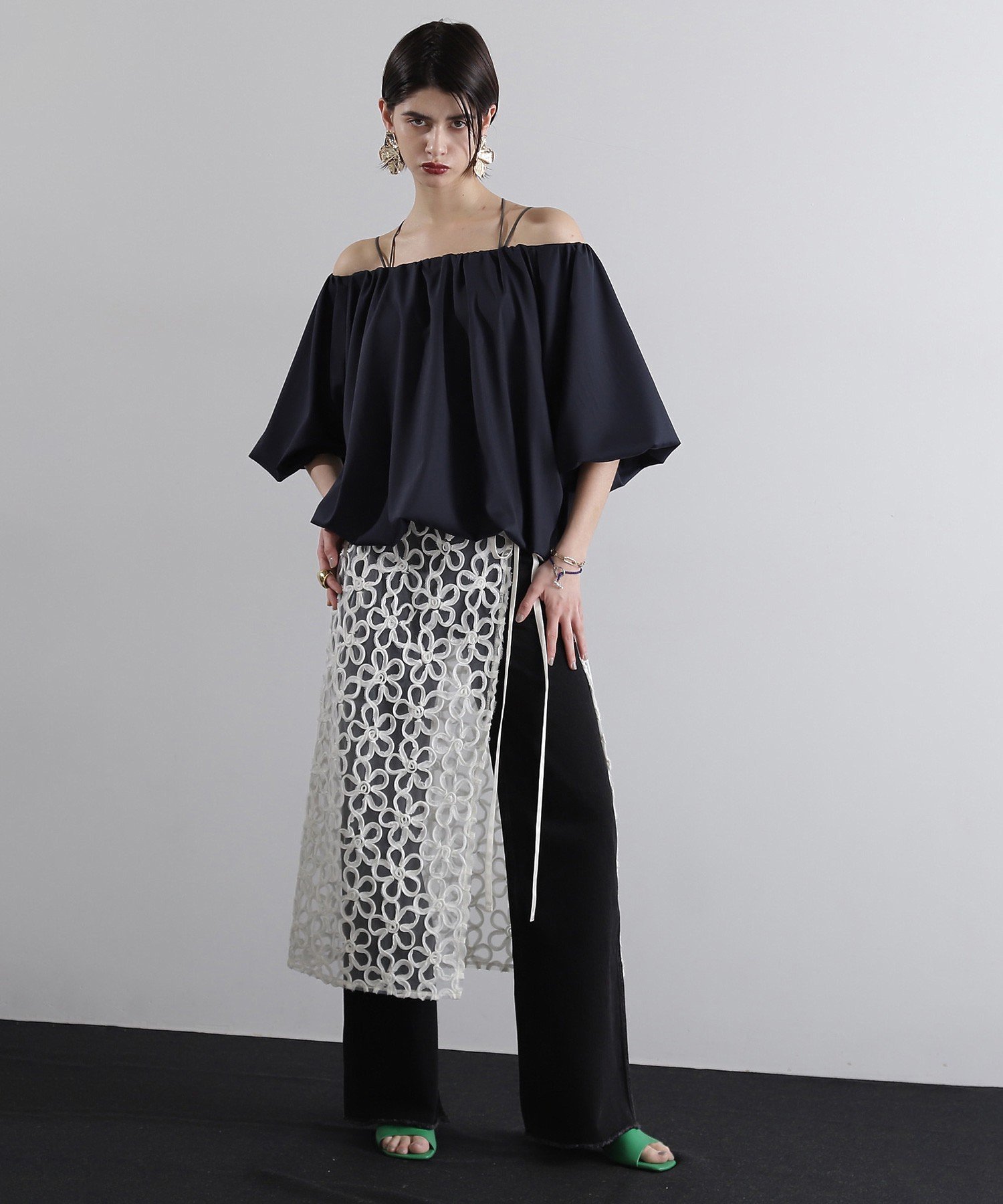 Большое количество ткани создает ощущение объема, но мягкий, струящийся материал придает ей более тонкий оттенок.