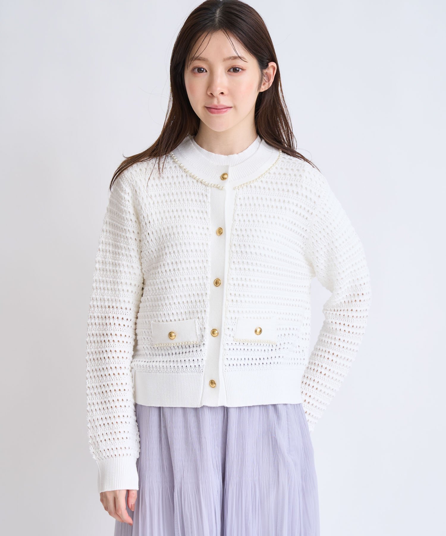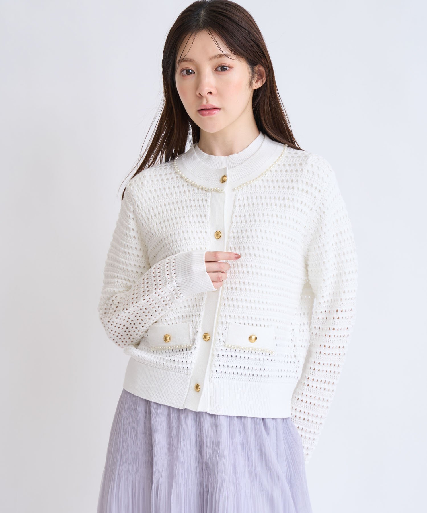 Этот вязаный кардиган украшен великолепной кружевной вязкой и вышитыми жемчужинами.