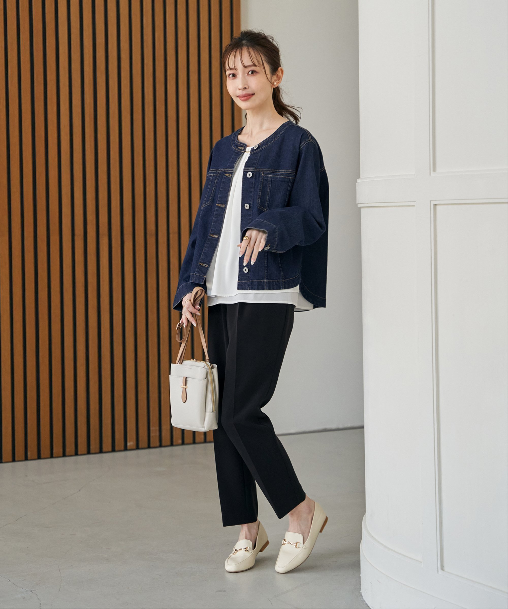 Созданная на основе классической джинсовой куртки, она имеет дизайн без воротника и закругленный нижний край для ощущения легкости.