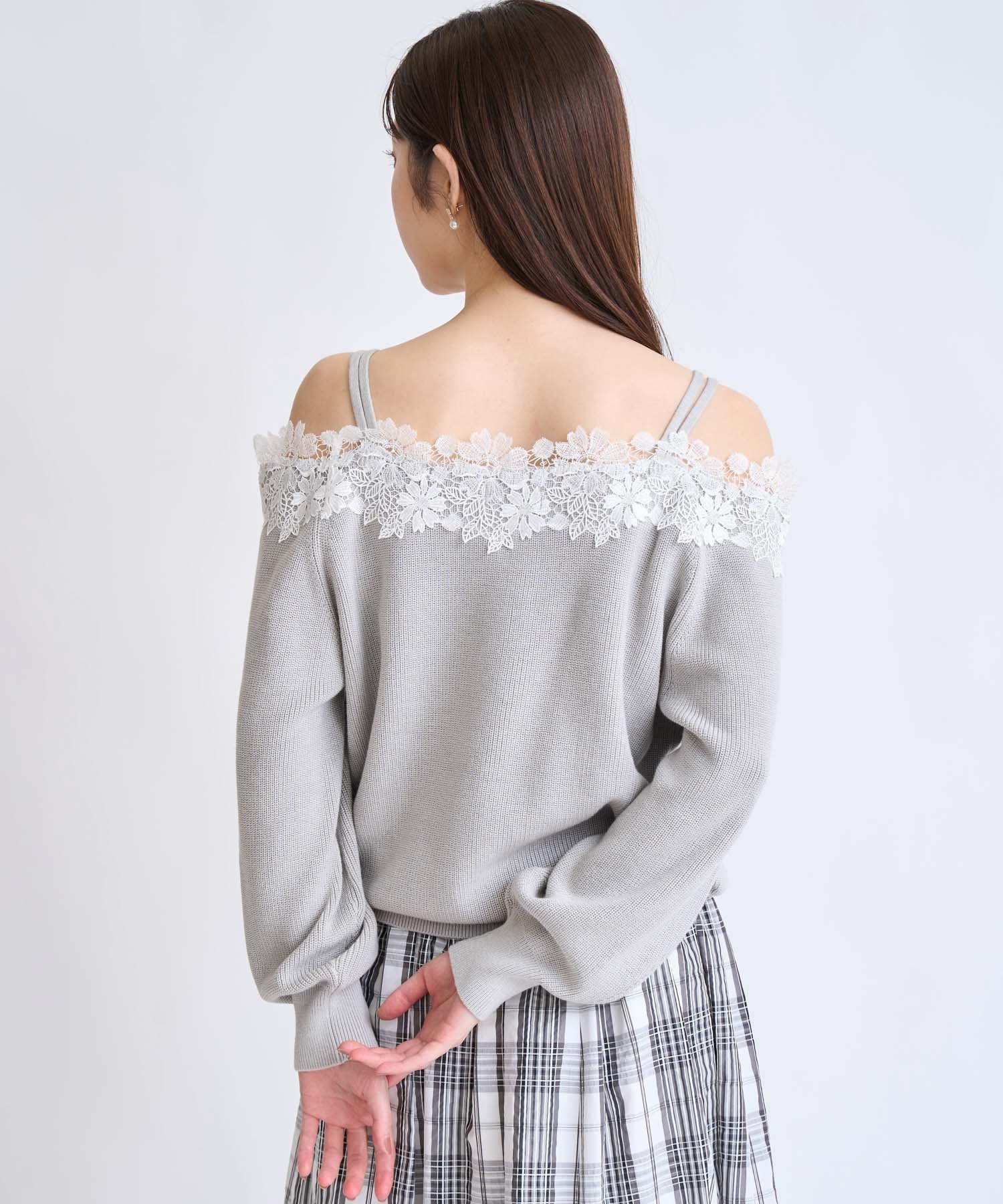 Этот модный трикотажный топ с открытыми плечами украшен нежным кружевом в области декольте.