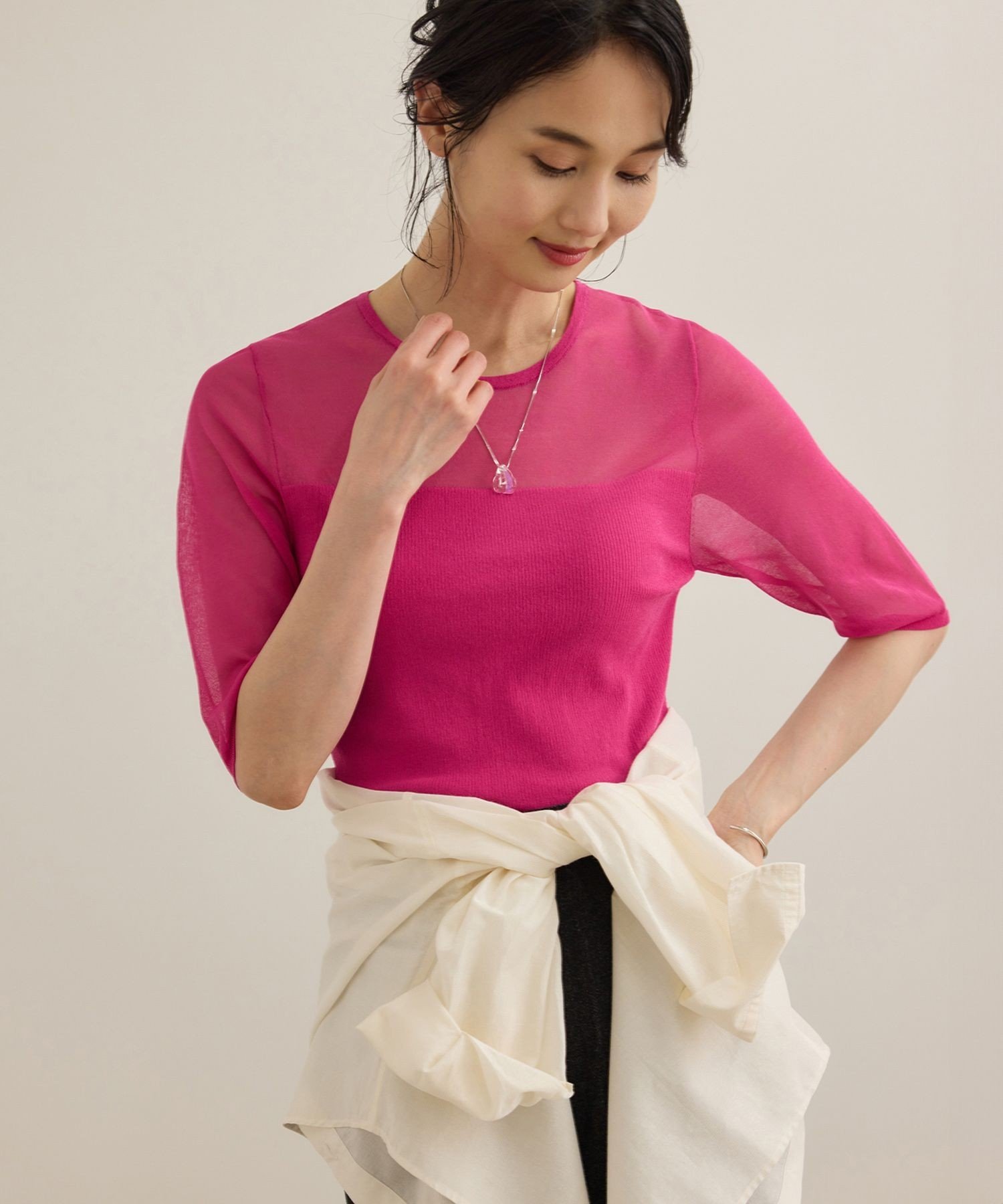 Красивый топ, который выделяется сам по себе, сочетая прозрачность с ощущением защищенности. Прозрачная область груди создает стройный силуэт даже в заправленном под жакет виде. [Дизайн/Силуэт]