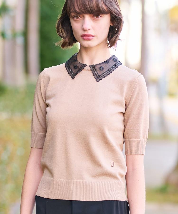 Воротник из органзы с оригинальным вышитым узором съемный, что позволяет носить изделие как простой круглый вырез, делая его двухсторонним.